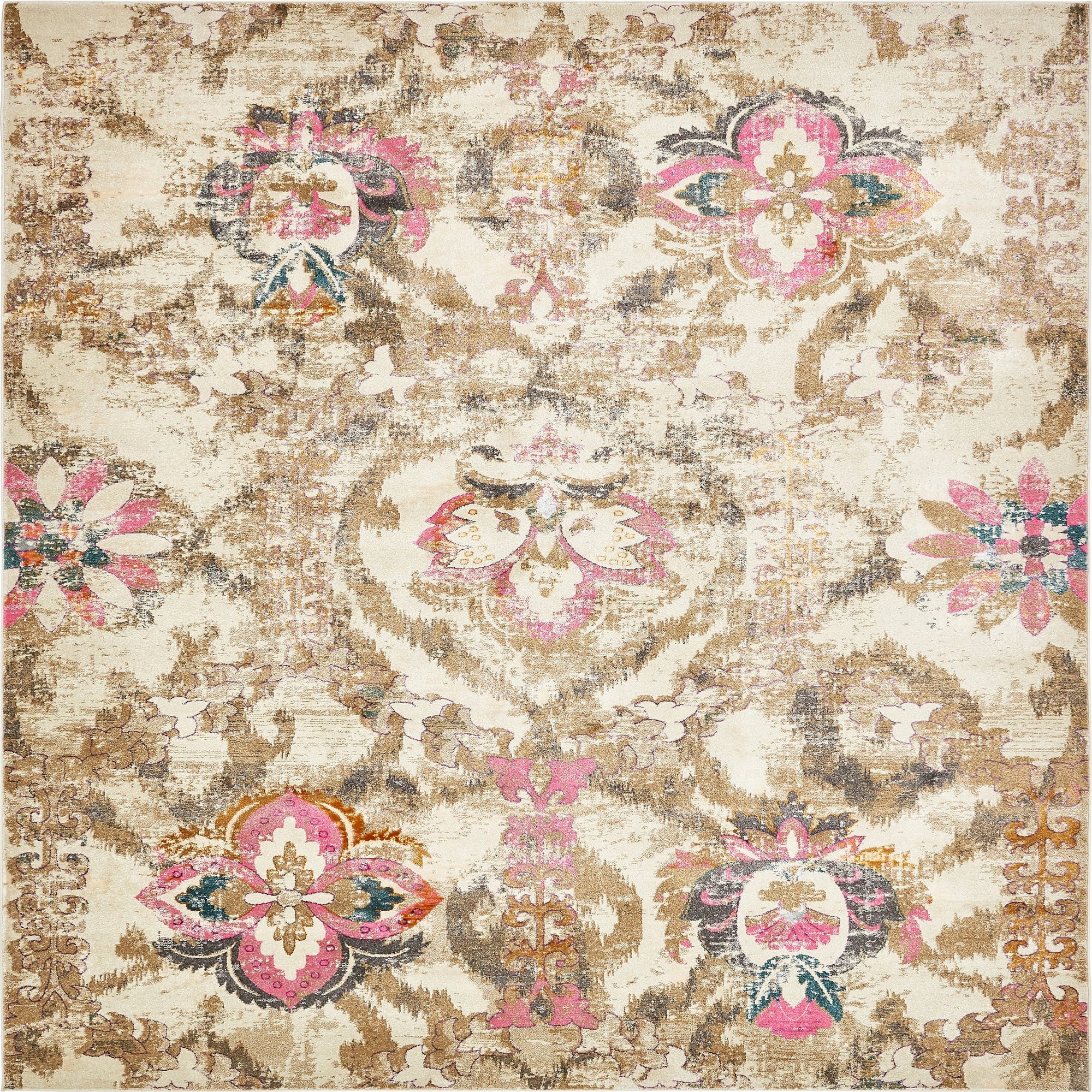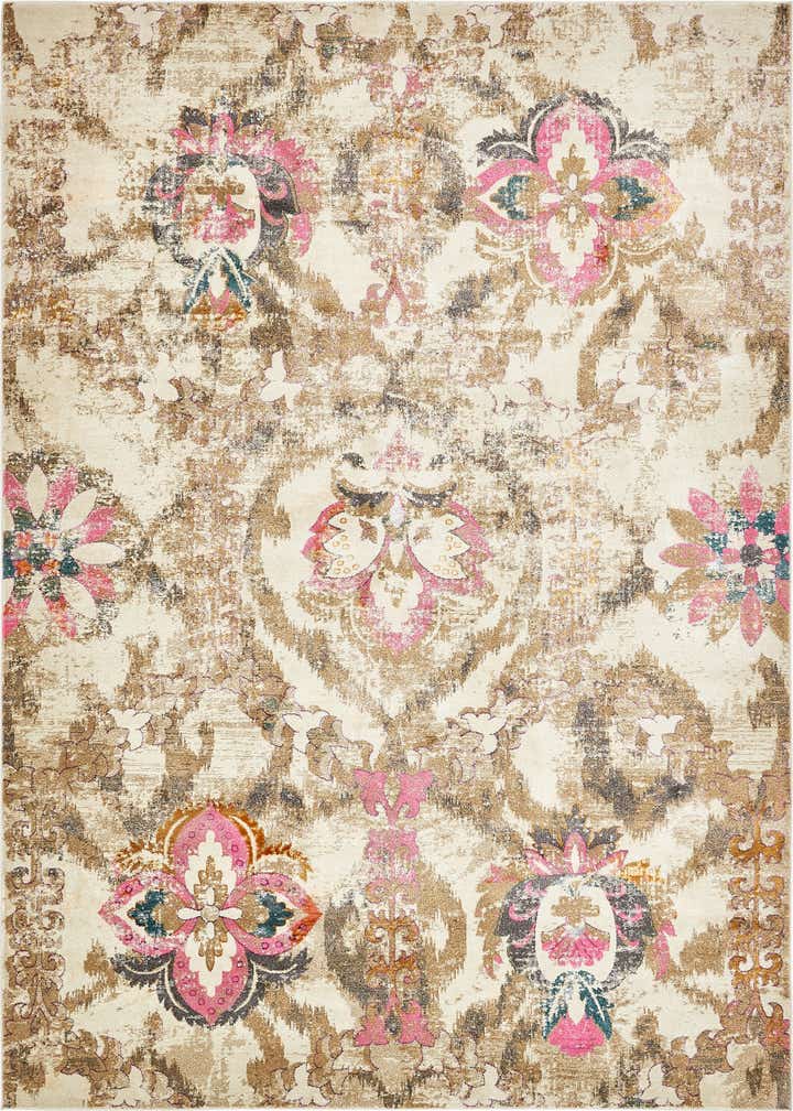Primary color is Beige. Colors in this rug include: Beige, Gray, Orange, Pink, Light Blue, Brown, Gold.