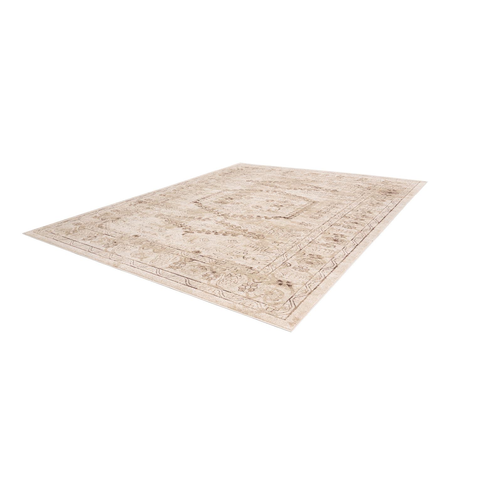 A softly worn, traditional medallion design anchors this rug, with a beige field that provides a warm, neutral canvas for cream, ivory and brown motifs. A narrow inner frame and a broader outer border are punctuated by floral rosettes and geometric accents, while scrolling vine details and a subtle hexagonal center motif add classic character without heavy contrast. The overall effect is an aged, low-contrast look that brings pattern and depth to a room while maintaining a calm, cohesive palette.