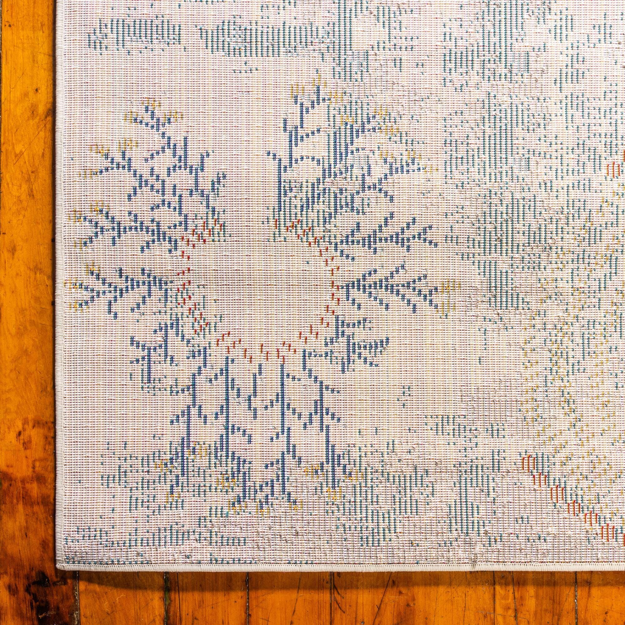 Primary color is Beige. Colors in this rug include: Beige, Green, Light Blue, Navy Blue, Orange, Red, Yellow.