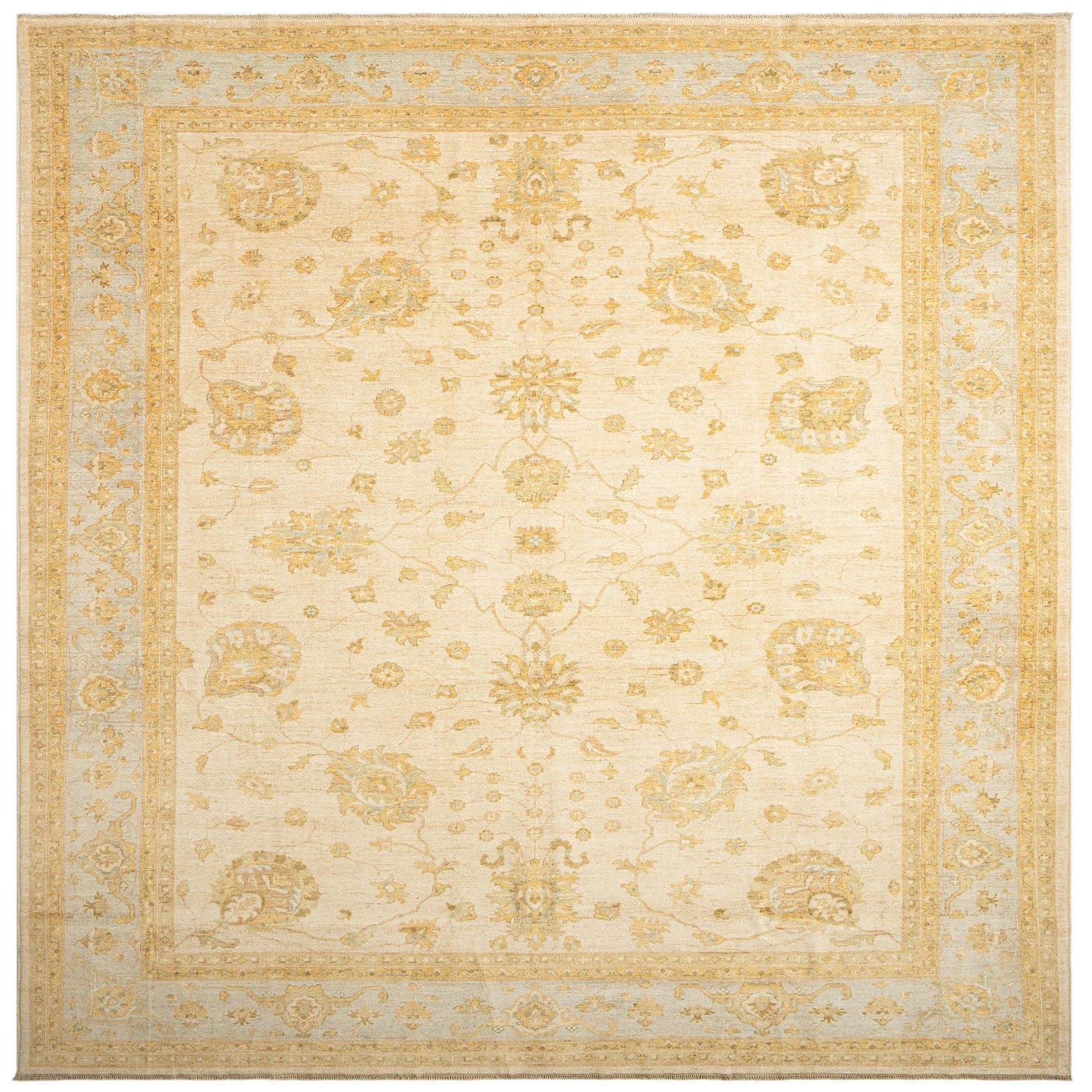 A 9x12 rectangular Kaizar Persian rug in cream and tan with intricate floral patterns and a light blue border.