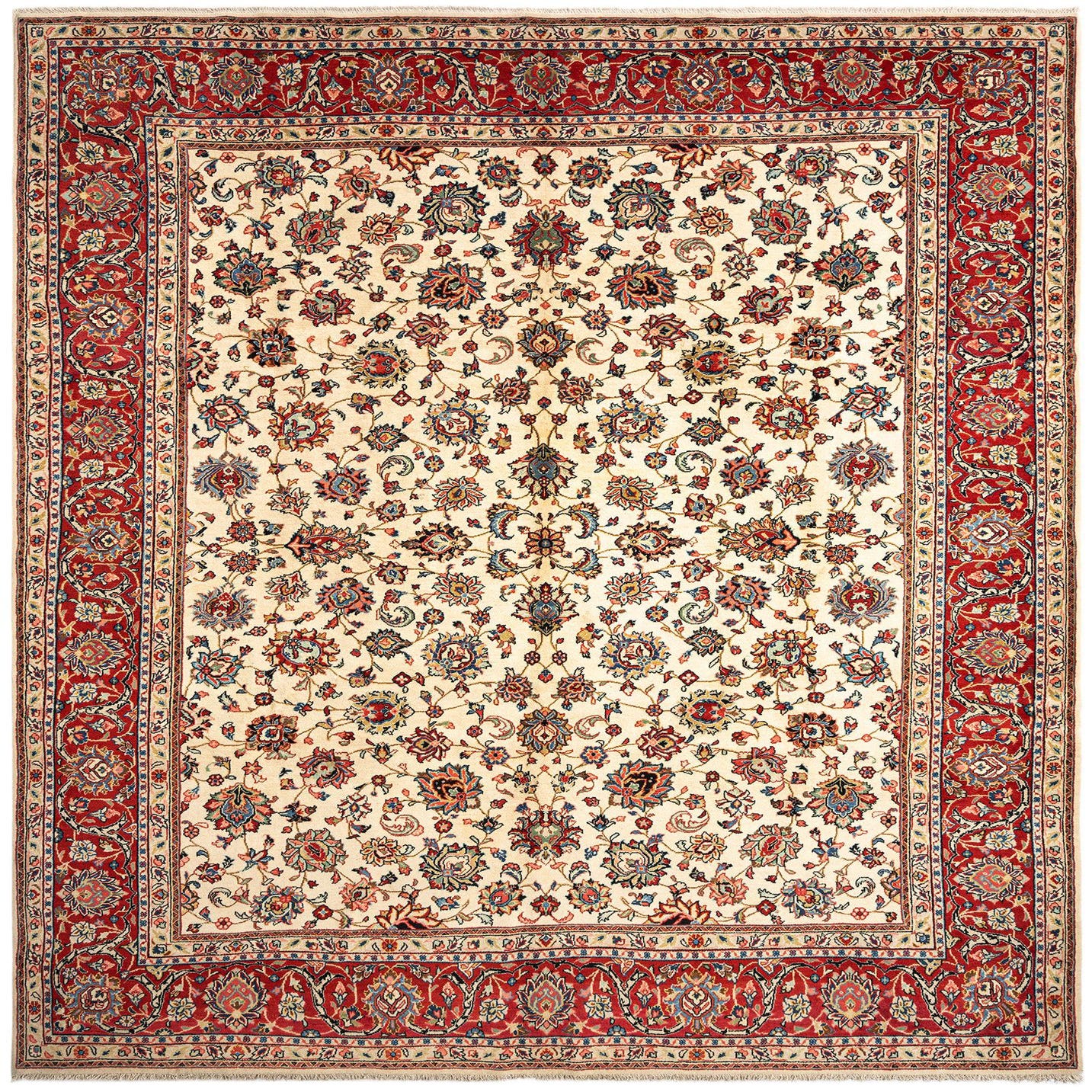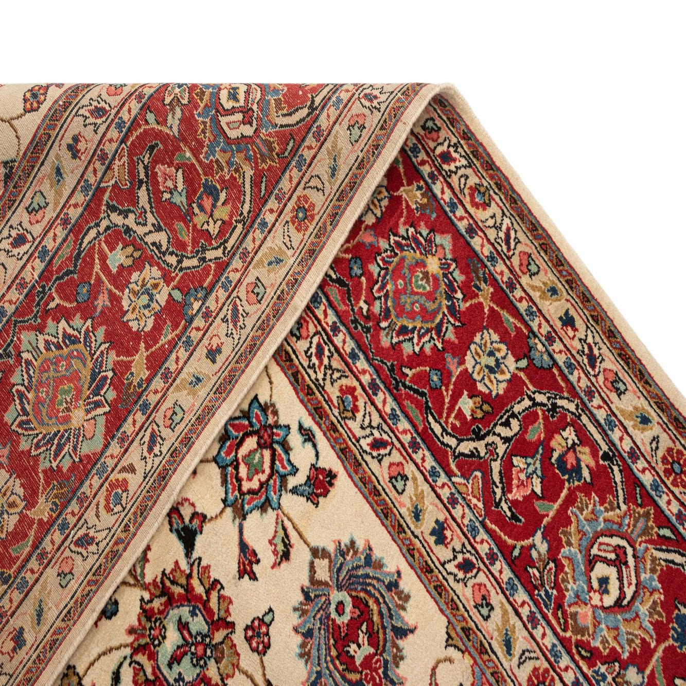A 9x12 rectangular Kashan Persian rug with a cream field and intricate floral patterns, bordered by rich red.
