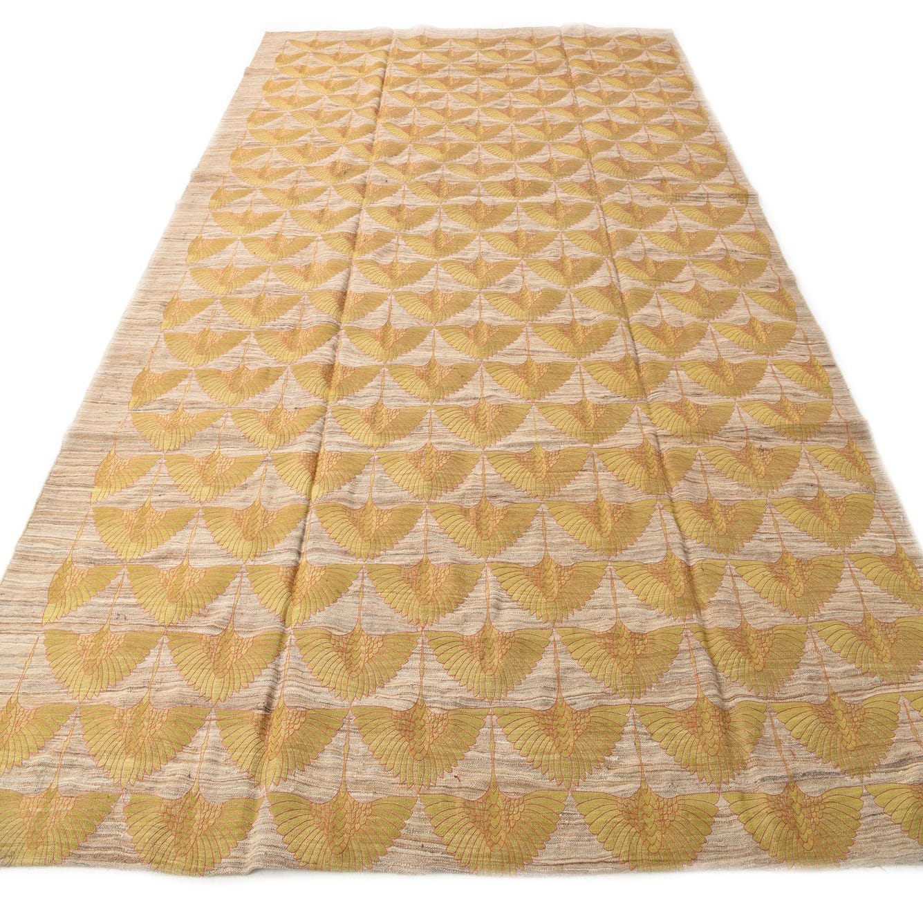 A 9x12 rectangular Kilim Modern rug with a flatweave texture, featuring a repeating fan-like tribal pattern in golden yellow on a natural brown and tan background.