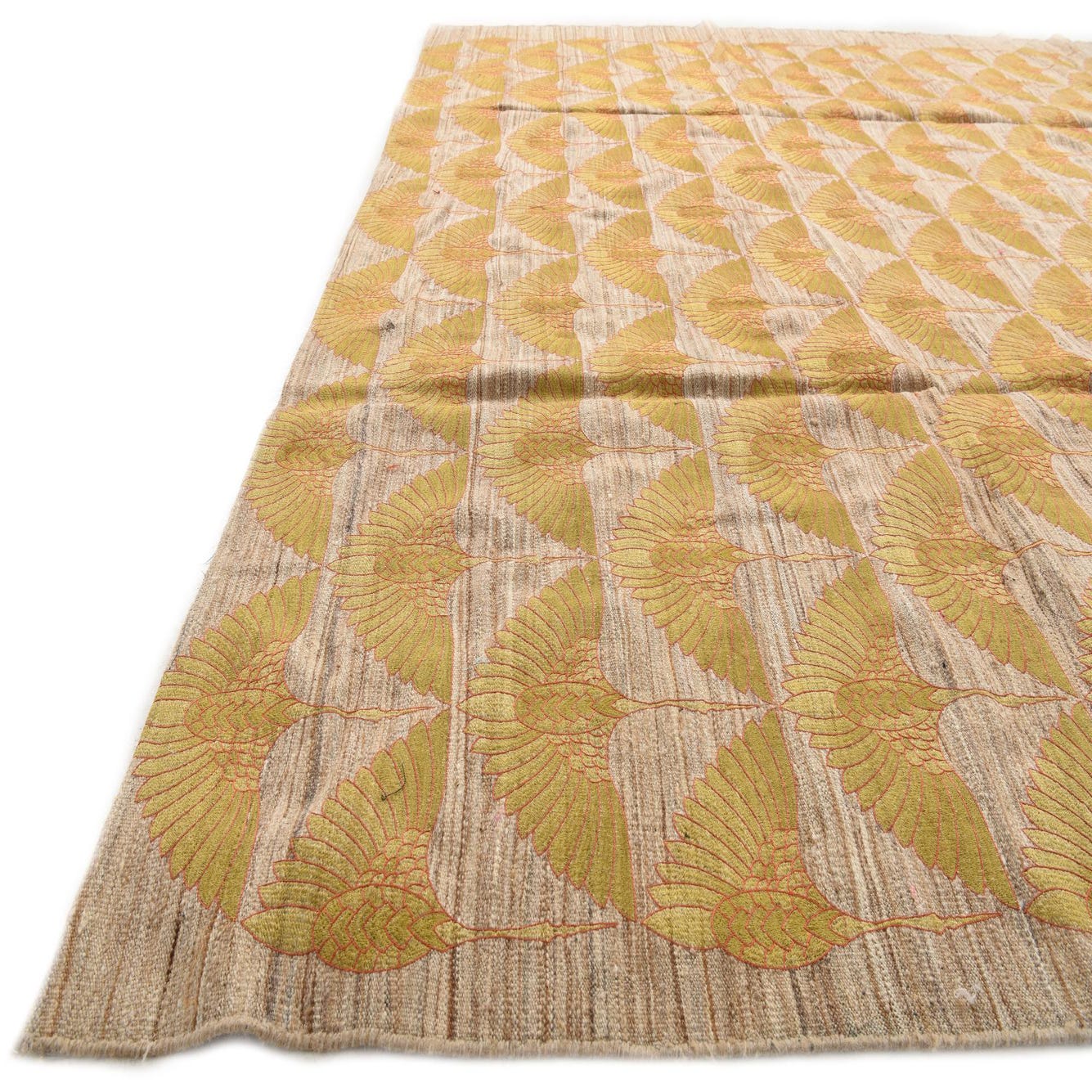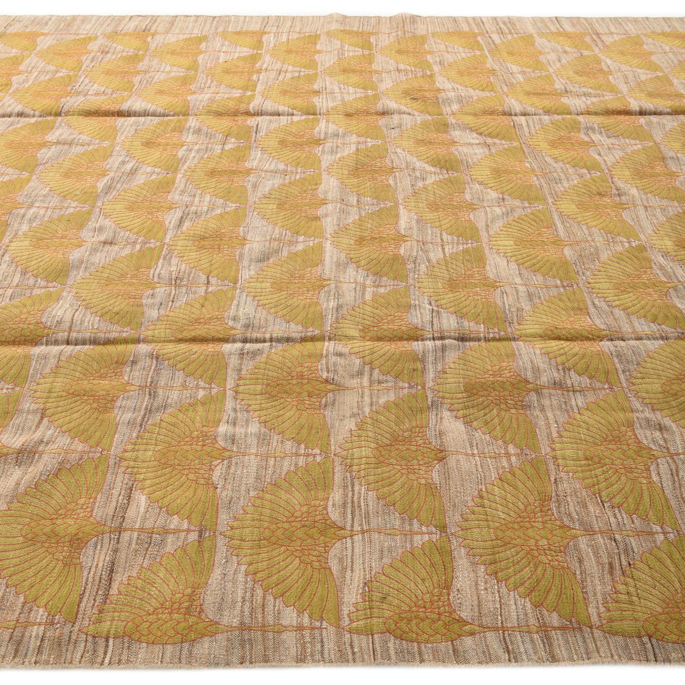 From the Kilim Modern collection, this hand-woven 9x12 wool rug exemplifies contemporary design with its geometric pattern and nuanced color palette. The repeating motif, rendered in shades of beige, light green, olive, and yellow, provides a sense of symmetry and balance. The background in beige offers a neutral foundation that frames and accentuates the dynamic pattern.