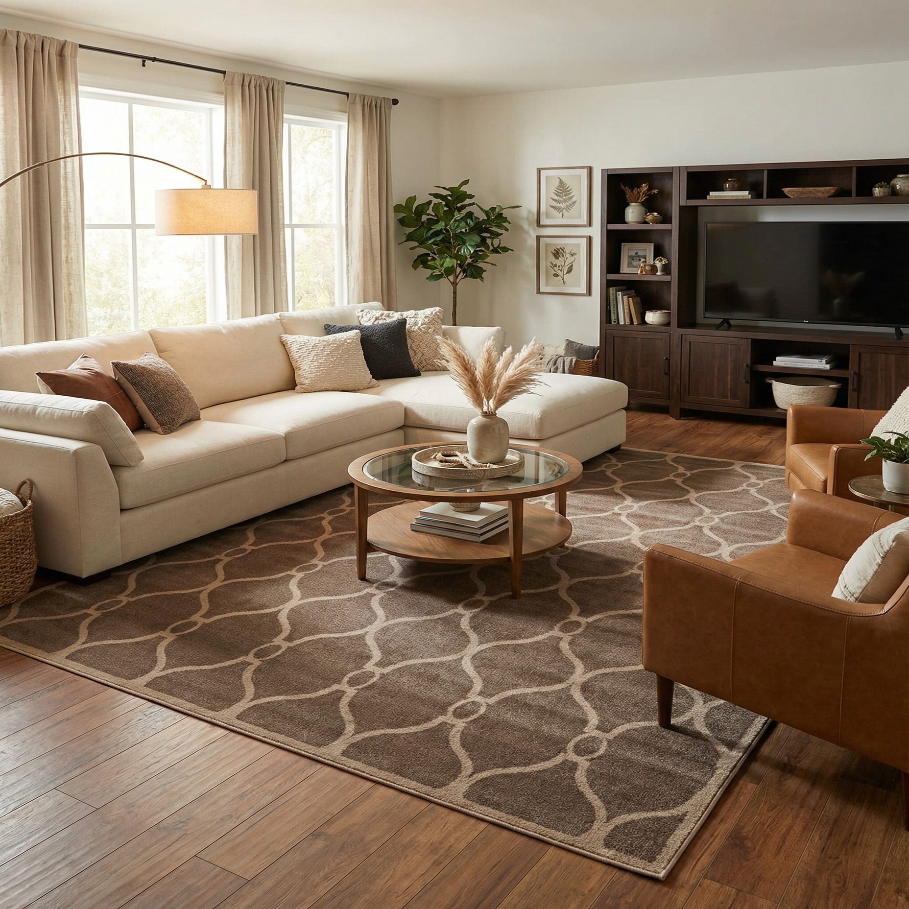 A 9x12 rectangular brown and tan area rug with a modern transitional lattice pattern, suitable for a living room.