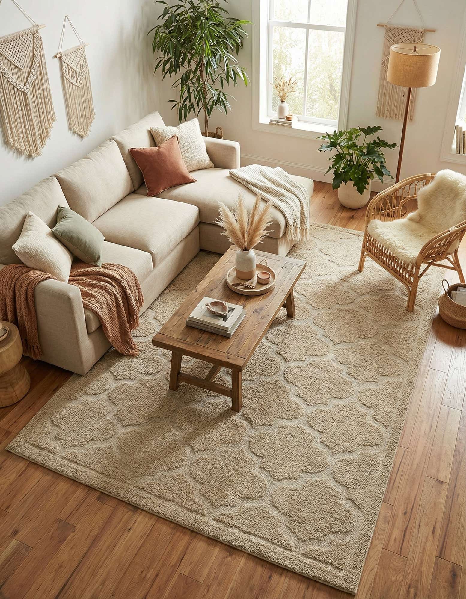 A 9x12 rectangular tan and ivory shag rug featuring a subtle high-low lattice pattern, perfect for a living room.