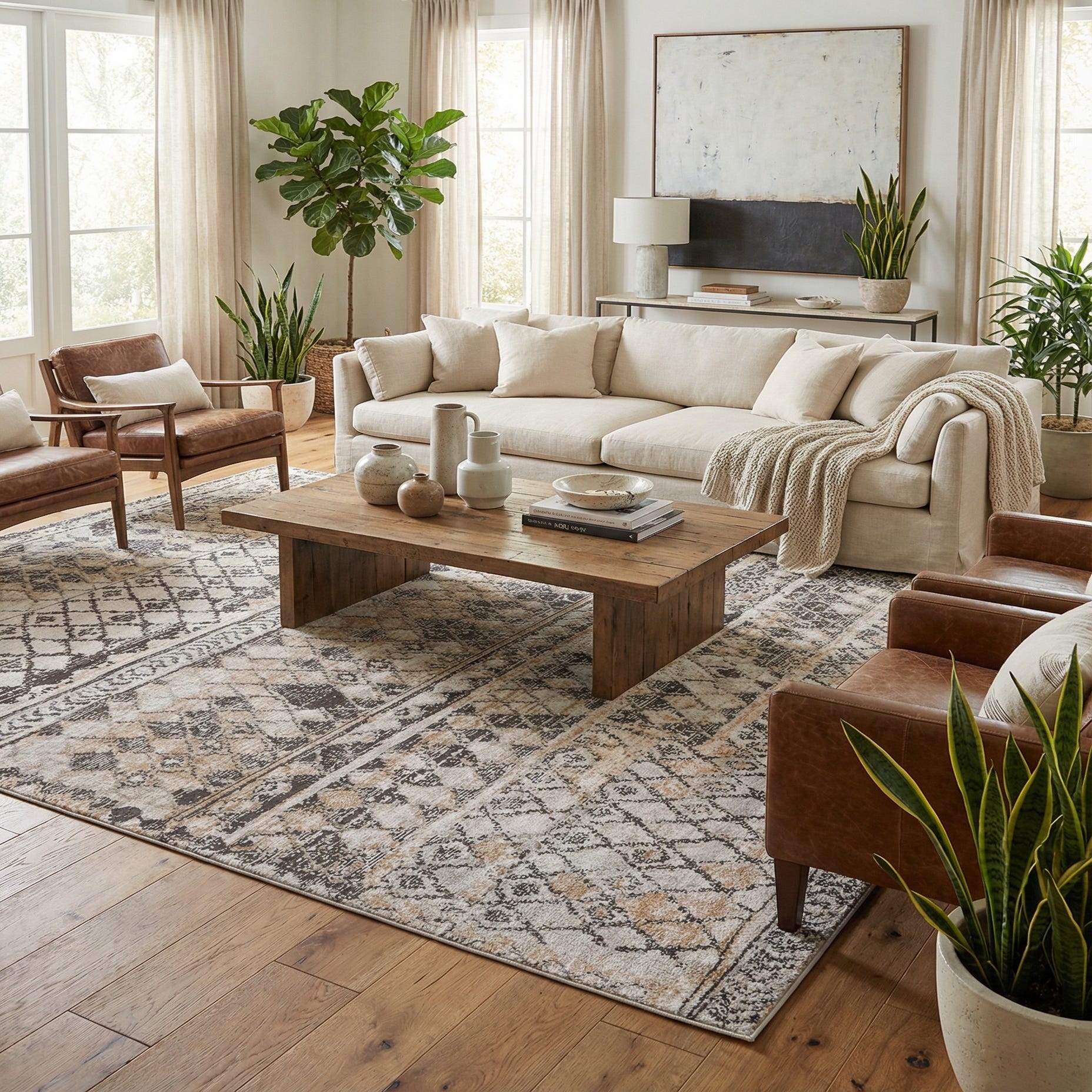 This rug works well as an anchor in a living room or family space, under a coffee table or layered beneath a bed to add pattern without heavy contrast. It pairs naturally with neutral upholstery, weathered wood furniture, and mixed-metal accents, fitting transitional, modern farmhouse, and contemporary bohemian interiors. Use it to warm a dining area or to add pattern to a minimalist space where subtle texture and calm color will tie the room together.