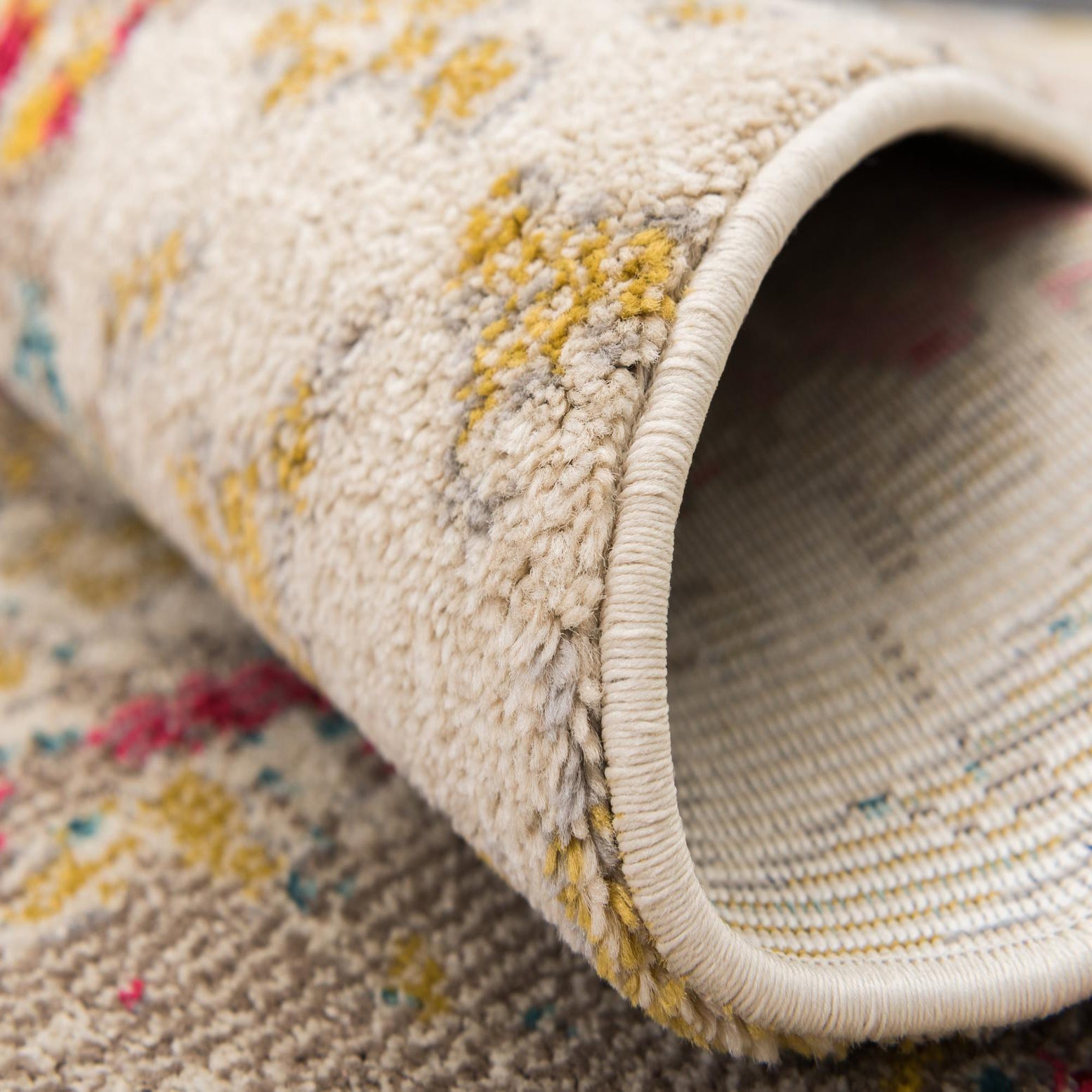 Primary color is Beige. Colors in this rug include: Beige, Light Blue, Orange, Puce, Red.