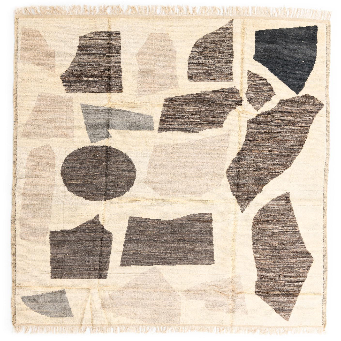 This Moroccan collection rug is hand-knotted of 100% wool and measures 9x12 feet, presenting a geometric pattern adorned with abstract shapes. The neutral beige background is overlain with bold shapes in a harmonious palette of beige, black, brown, and gray, giving the rug a distinctive and modern appeal. The textural contrast within the pattern provides a tactile quality to the design. Detailed with fringe, the rug adds an element of traditional craftsmanship.