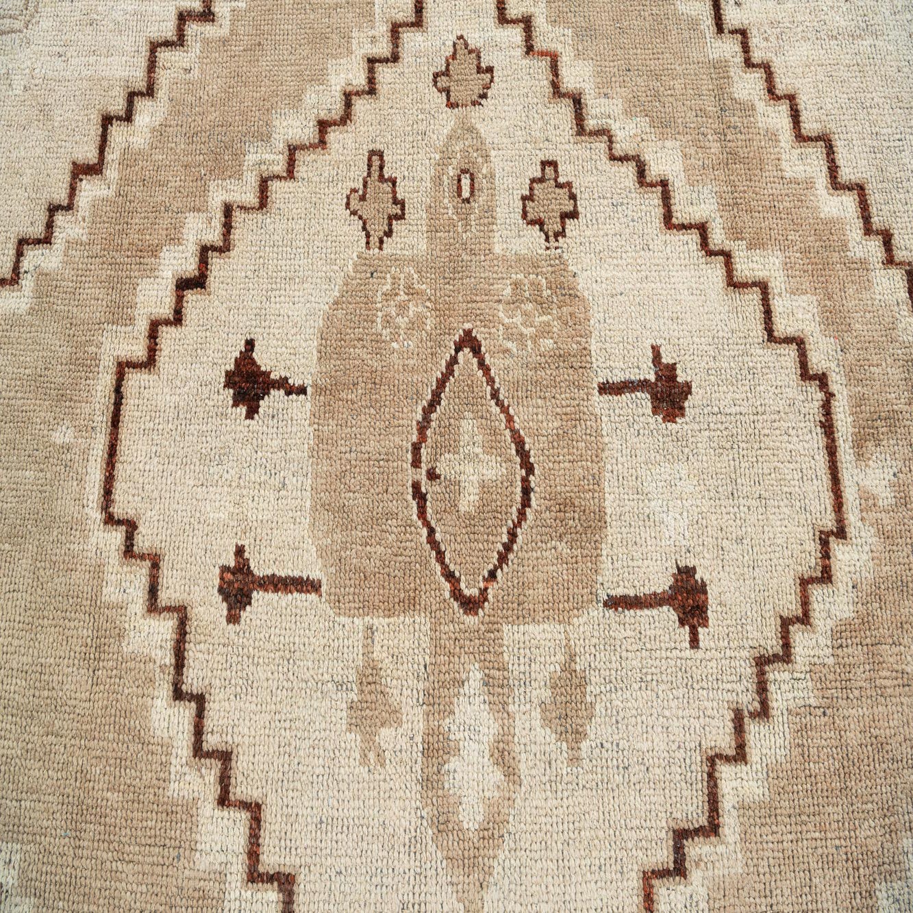 Hand-knotted from 100% wool, this rug presents a warm, geometric medallion design with stepped diamond frames and stylized rosette accents. The beige background provides a soft, neutral field for ivory highlights and brown outline details that define the central motifs and border. The pattern balances structured zigzag lines with softer, floral-inspired elements for a look that is both grounded and refined.