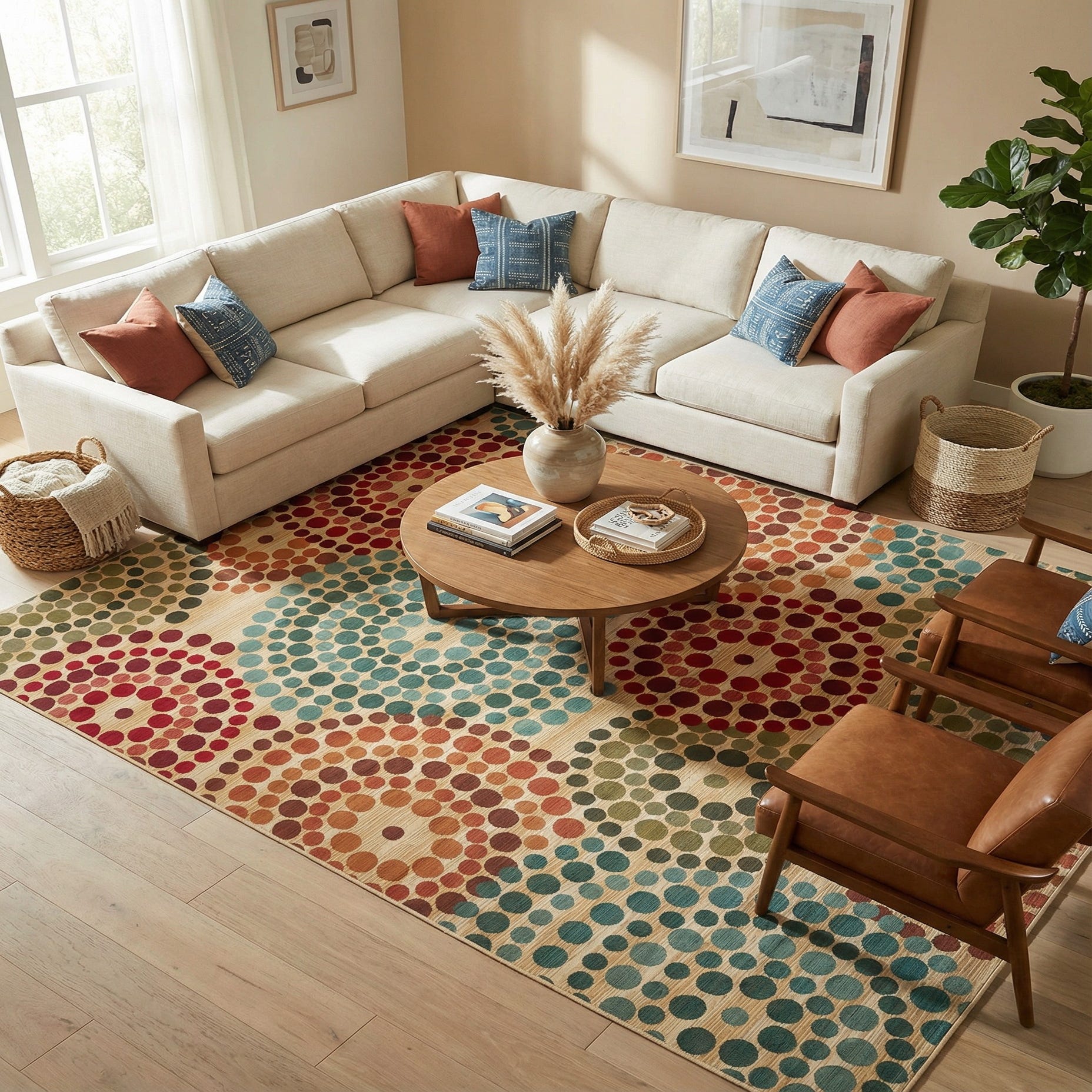 A lively, modern pattern of concentric dot clusters sits on a warm beige field, creating a layered, geometric look that reads both playful and structured. Rings of dots in blue, brown, green, orange and red overlap across the surface, while subtle horizontal striations in the beige background add visual depth. The low-profile, tightly woven polypropylene construction gives the rug a smooth, slightly firm hand with gentle texture where the circular motifs sit against the ground.