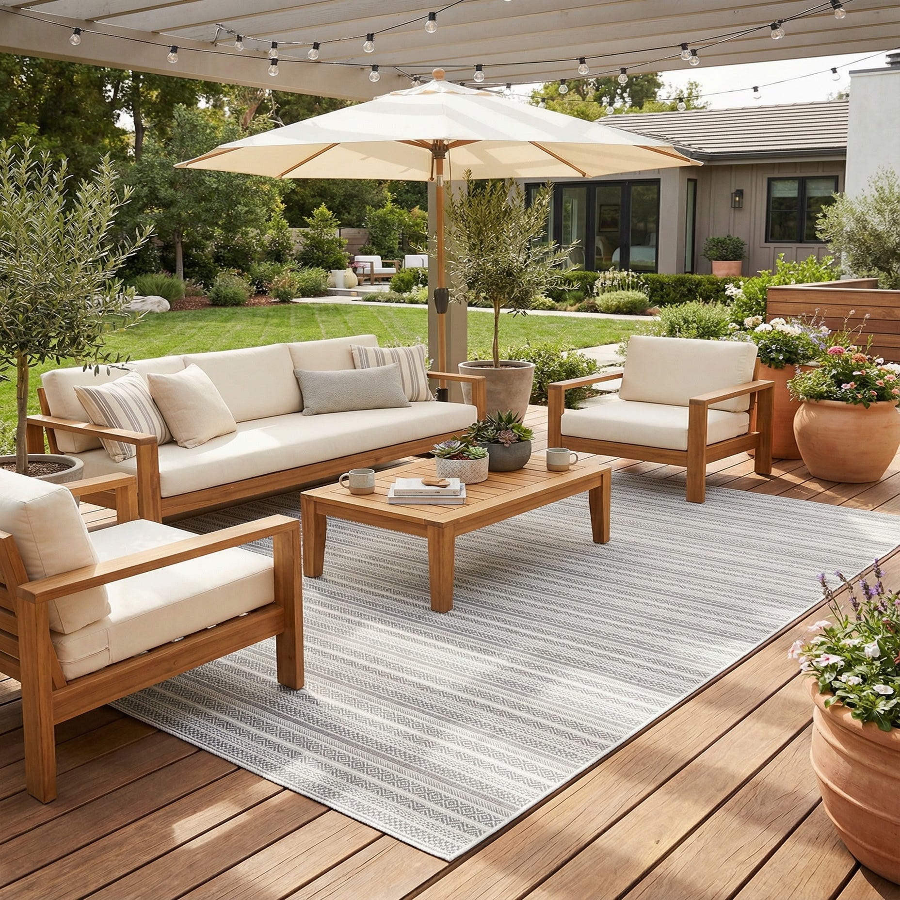 This rug works well where you want a neutral foundation with visual interest — under a dining table, on a covered patio, or layered in a casual living room. It complements coastal, modern farmhouse, and contemporary minimalist interiors, and pairs nicely with rattan seating, light wood tones, or black metal accents for a cohesive look.