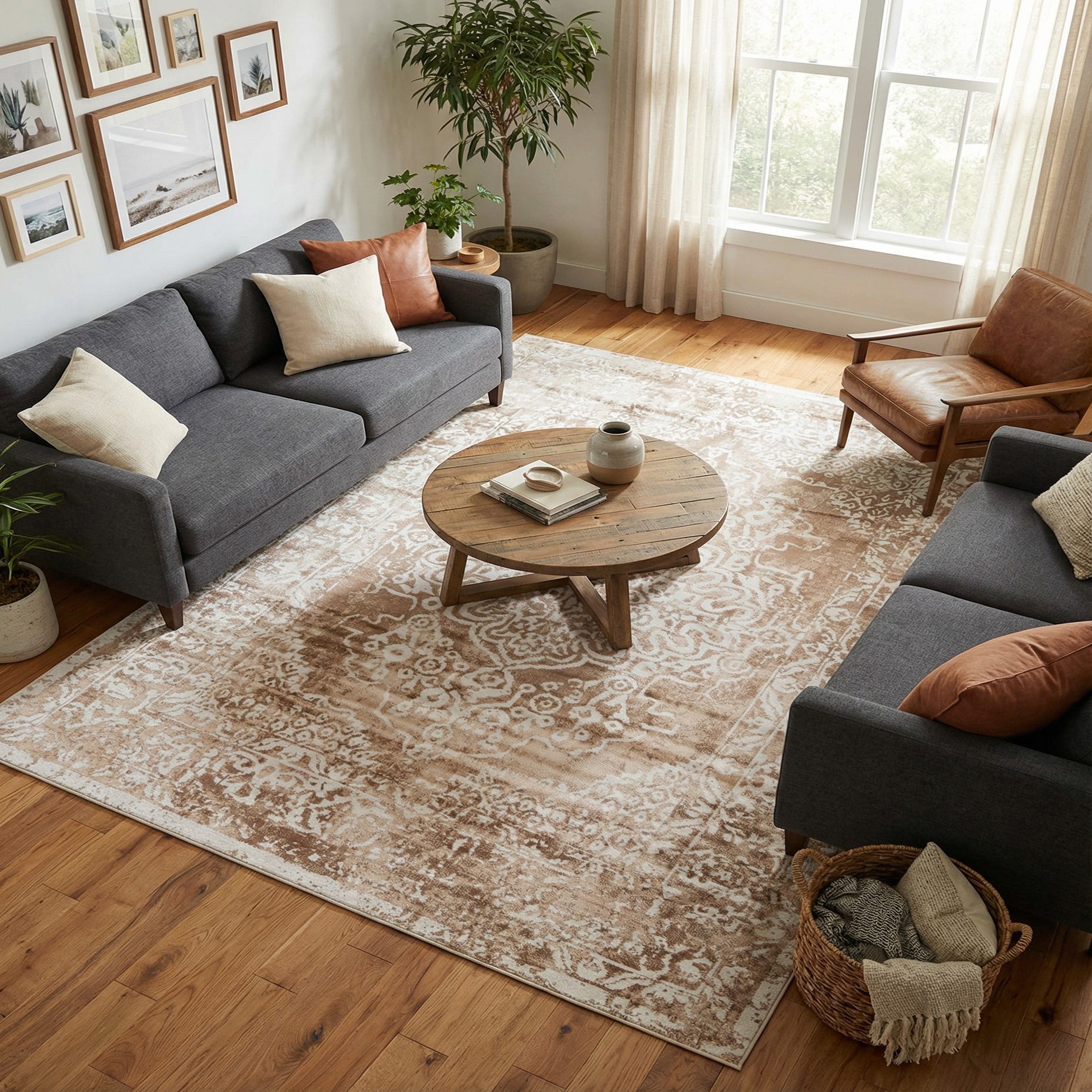 This neutral palette and transitional pattern work well in living rooms anchored by warm wood furniture and neutral upholstery, or beneath a dining table where the design adds quiet elegance without competing with table settings. It also pairs nicely with modern farmhouse, coastal, or Scandinavian interiors—layer it over wide-plank oak floors or use it to soften a minimalist bedroom for added warmth and texture.