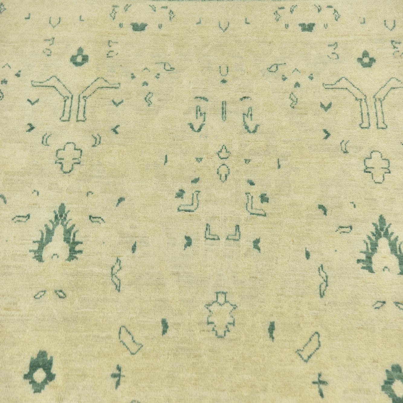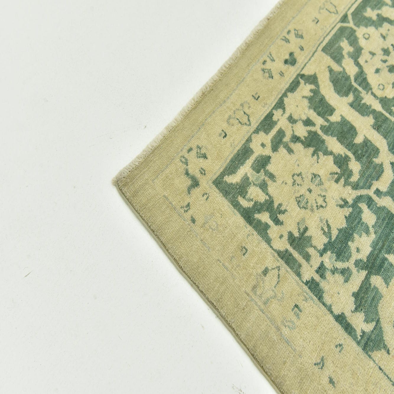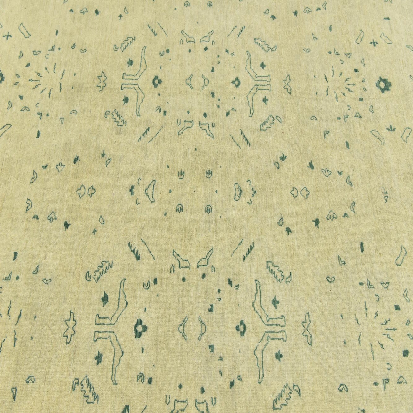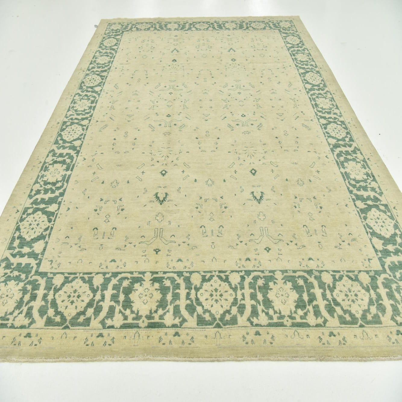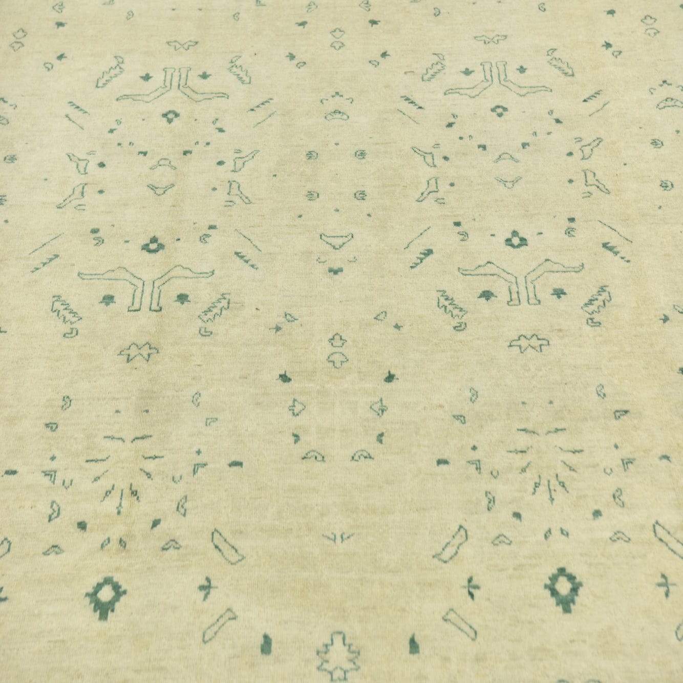 The Peshawar Ziegler rug, measuring 9x12 feet, is a testament to the skill of traditional hand knotting, crafted with 100% hand spun wool that provides a distinctly comforting texture underfoot. The rug features a beige background with a pattern composed of botanical and geometric motifs, giving it a balanced blend of traditional and abstract design elements. The color palette includes subtle variations of green which are used to define the detailed border and to accentuate the central pattern. This soft color scheme allows for versatility when integrating the rug into an existing decor, making it suitable for a wide range of interior design scenarios.
