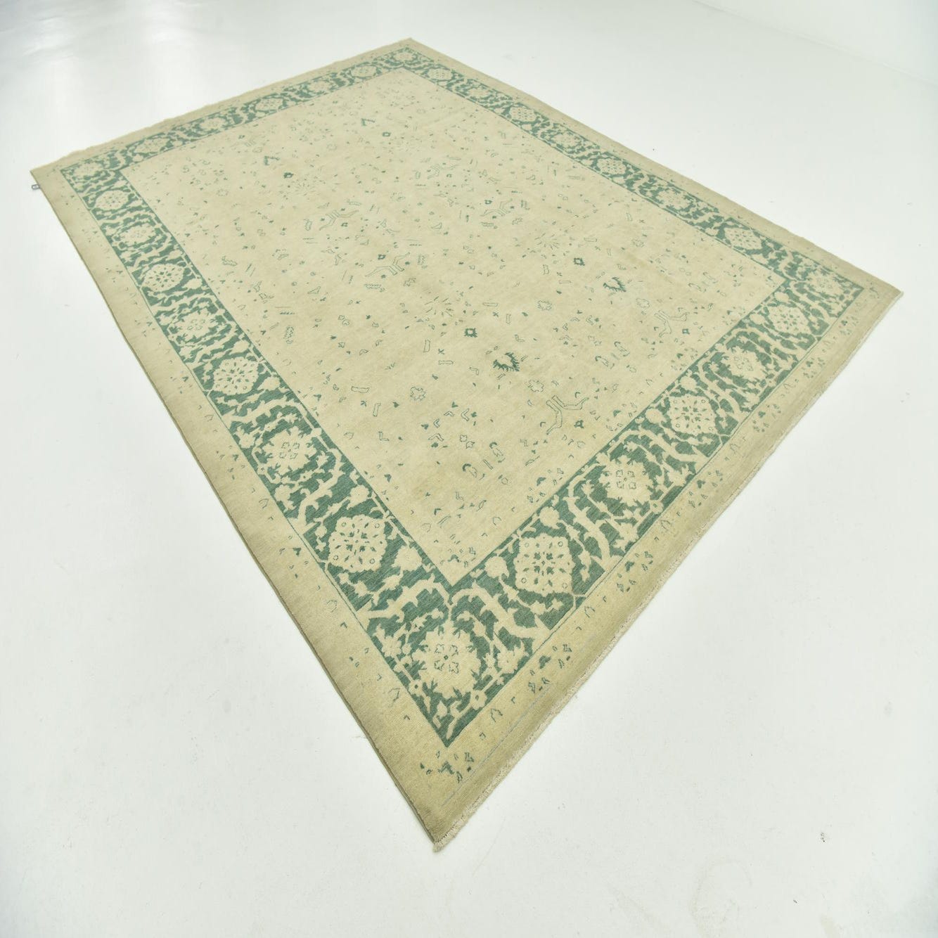 A 9x12 rectangular Peshawar Ziegler rug featuring a cream field with subtle botanical motifs and a bold green traditional floral border.