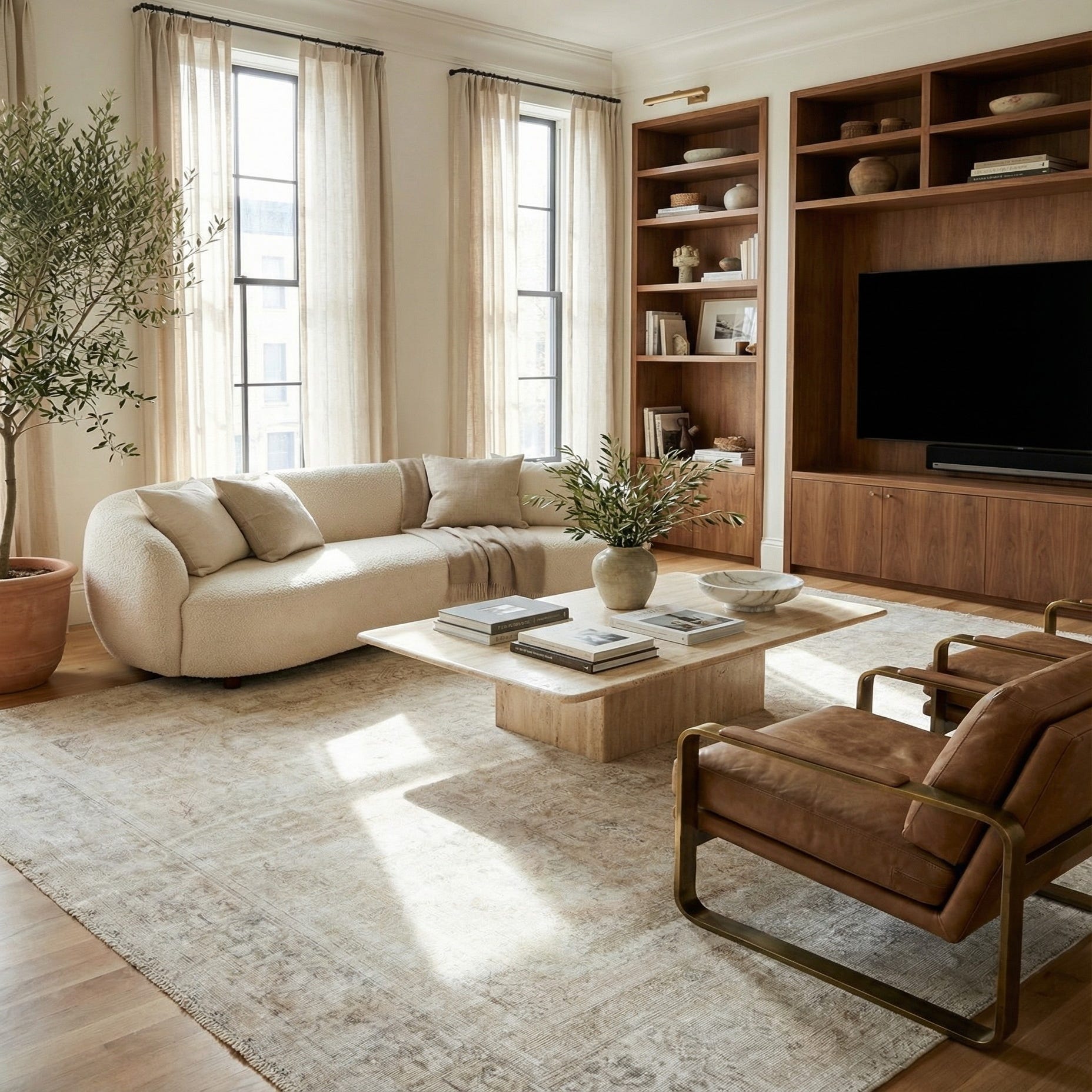 A 9x12 rectangular Ultra Vintage wool rug in shades of brown and ivory with a faded Persian pattern.