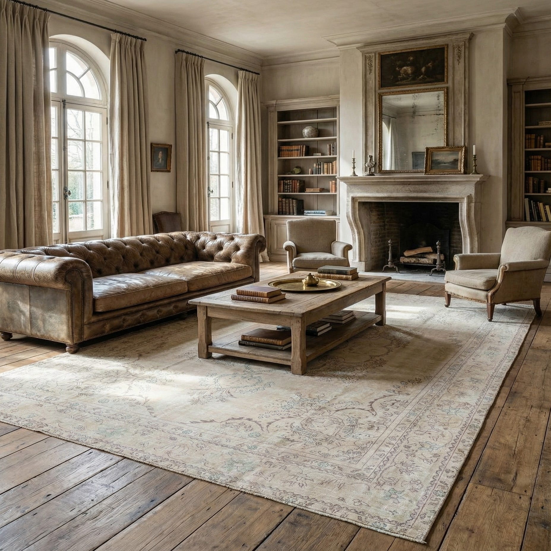 A 9x12 rectangular Ultra Vintage wool rug in shades of brown, tan, and cream, featuring a faded Persian medallion pattern.