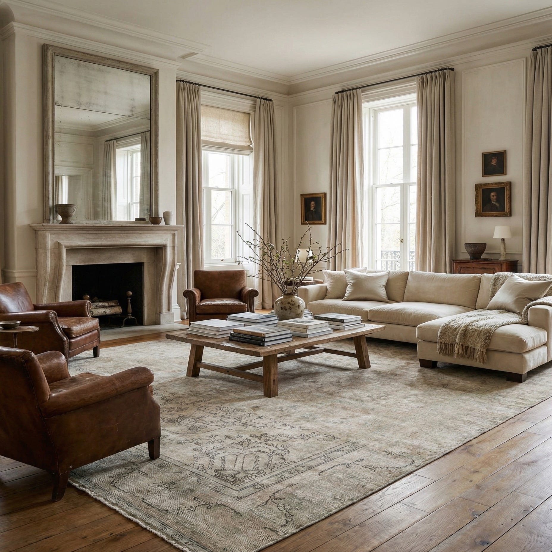 Its muted colors and timeless design allow for seamless integration into a variety of interior settings. This piece would complement a minimalist modern space by adding depth and warmth, or enhance a traditional setting with its classic elegance. It would work well anchoring a living room seating area, underpinning a dining room table, or adding an element of sophistication to a spacious bedroom.
