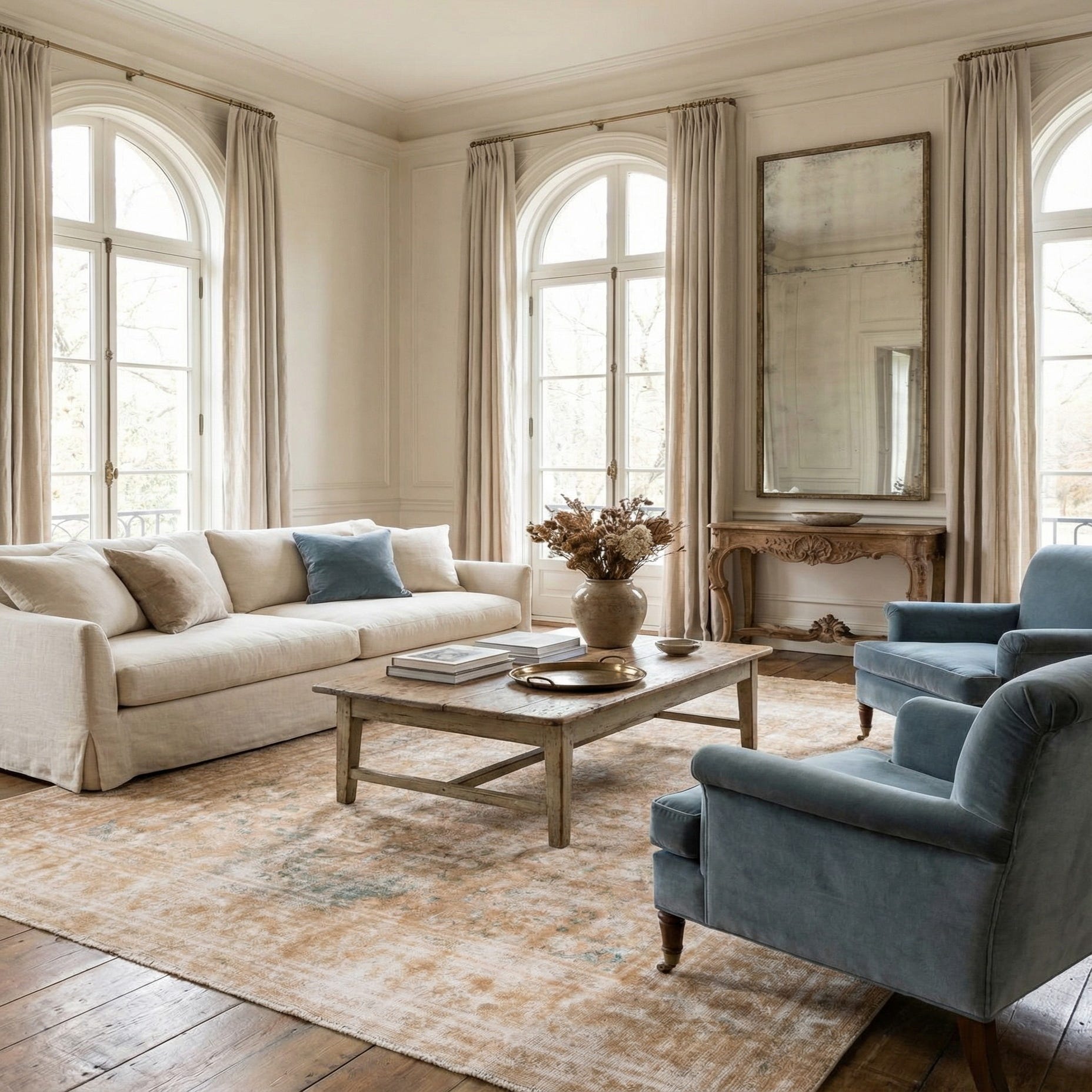 The hand-knotted wool construction has a tight, tactile weave with a gently worn nap that cushions underfoot and shows slight pile variation for added texture. This rug works well layered beneath a neutral linen sofa and warm wood coffee table, anchored in a dining room under a natural wood table, or as a soft foundation in a bedroom with light bedding. It pairs easily with navy or brass accents and suits transitional, coastal-inspired, and modern farmhouse interiors.
