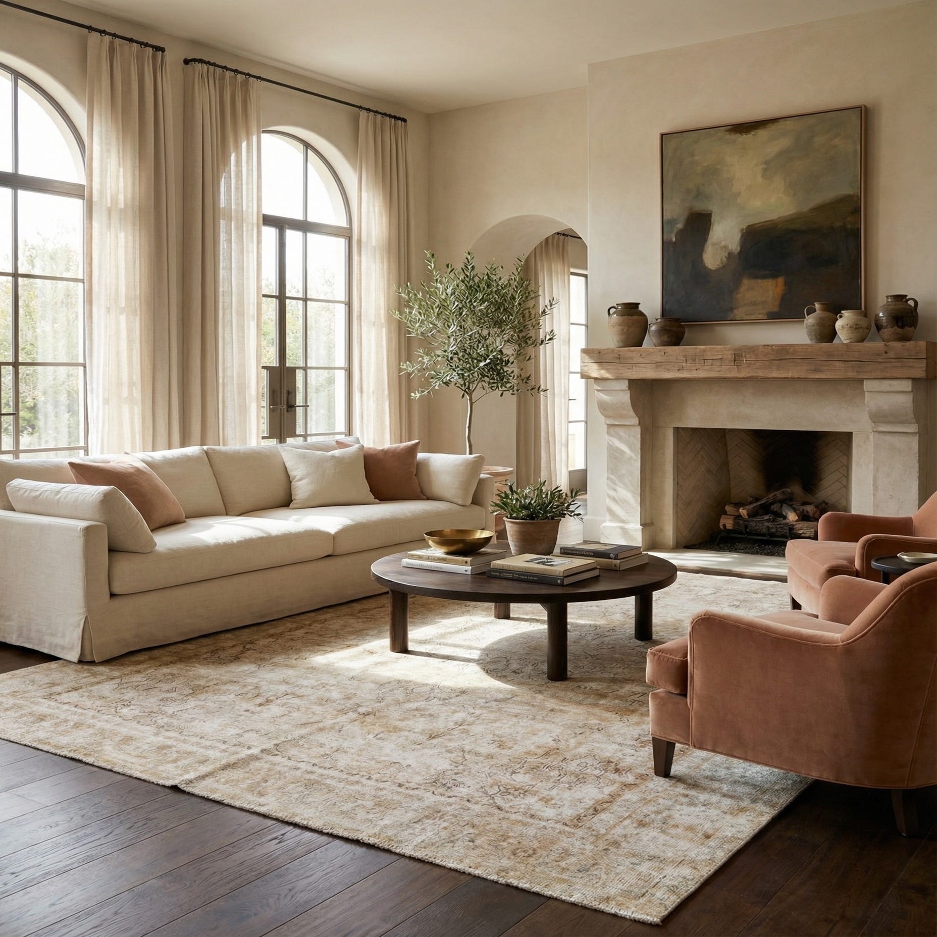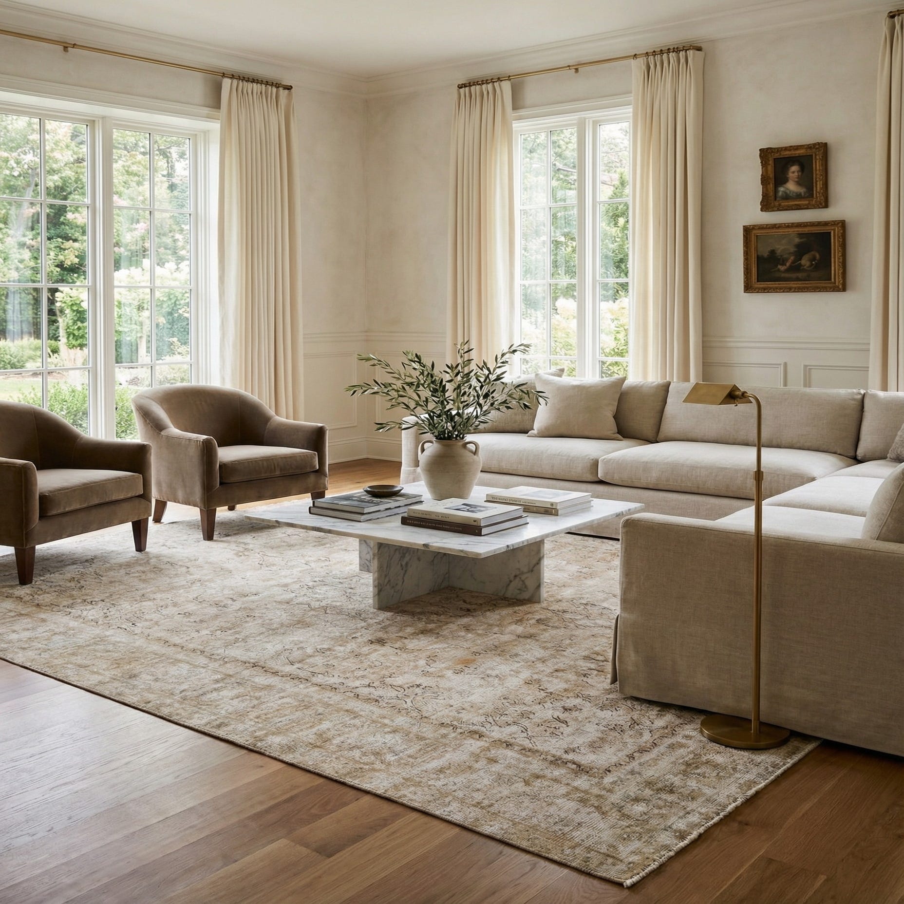 This piece's muted color palette and intricate design make it versatile for a variety of interior design scenarios. It would complement a traditional living room or dining area with its elegant patterns, as well as add warmth and interest to a more contemporary space with its neutral tones. Additionally, this rug could serve as a foundational piece in a transitional design scheme, bridging the gap between modern minimalism and classic opulence.