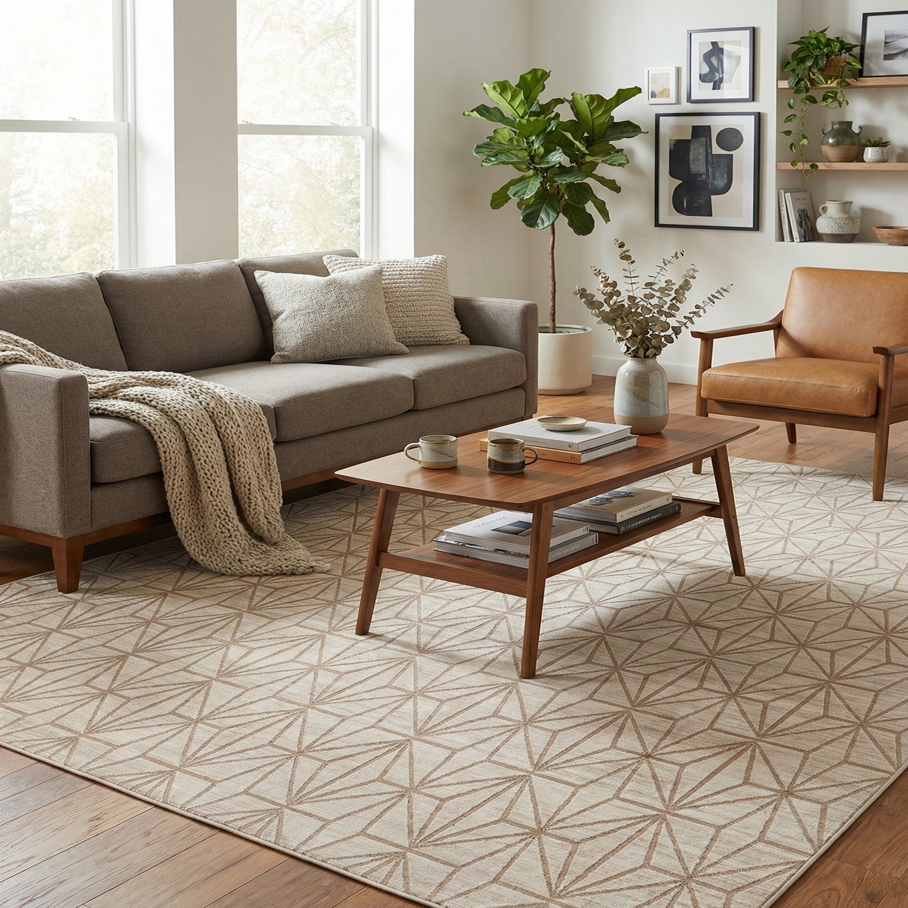 This neutral palette and linear pattern work well in living rooms and dining areas where you want to anchor furniture without overwhelming the space. It pairs particularly well with mid-century modern and Scandinavian furnishings, or with a contemporary neutral scheme that benefits from a bit of structured pattern. Use it to define a seating group, ground a dining set, or add calm texture to a bedroom or home office.