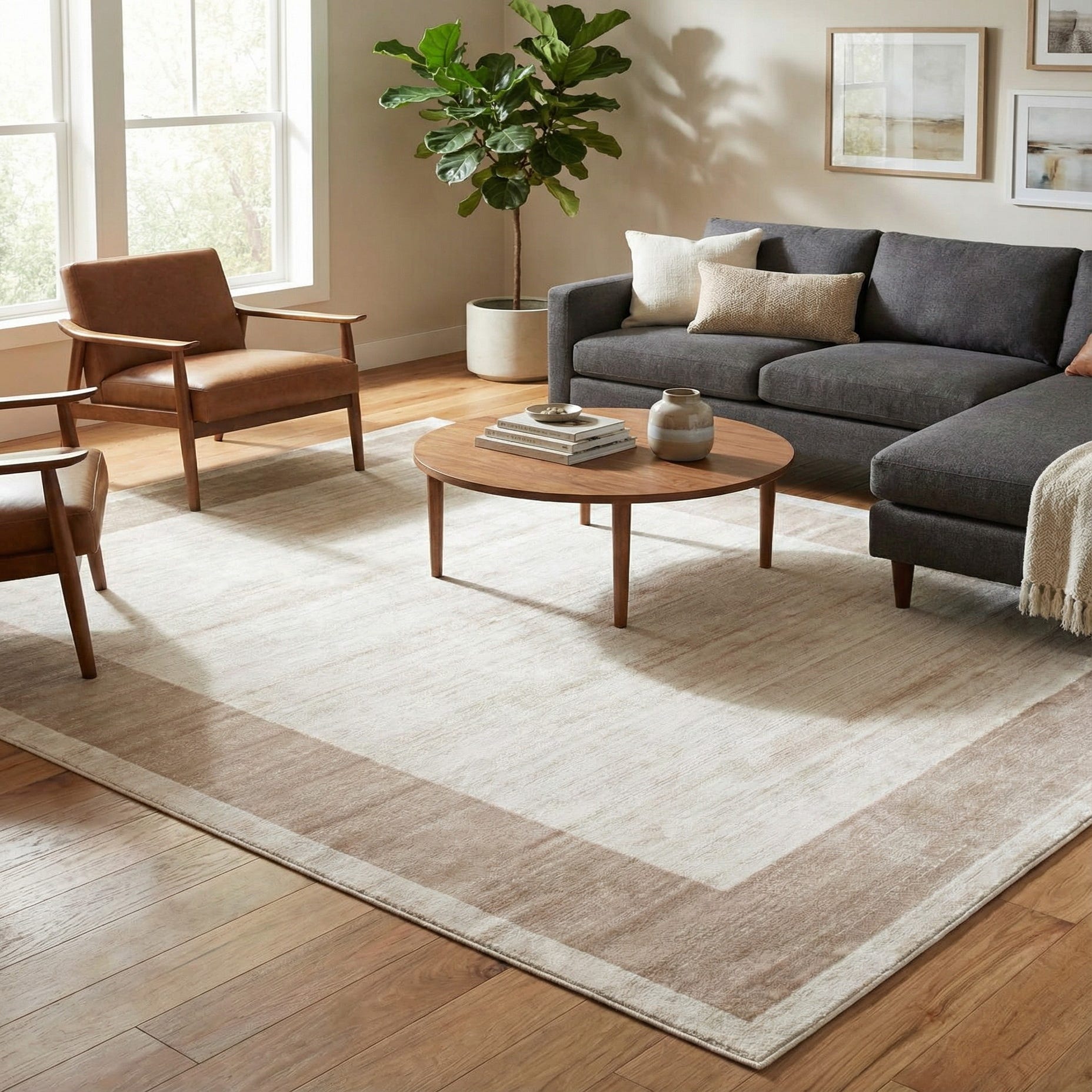 The Uptown Collection offers a serene addition to any space with its machine-woven 9x12 rug, crafted from a blend of 70% Polypropylene and 30% Polyester. The piece's design showcases a minimalist approach, featuring a subtle ombre transition that moves from a light beige center to a deeper light brown border, concluding with a clean cream edge. This color gradation creates a sense of depth and dimension without overwhelming the area.