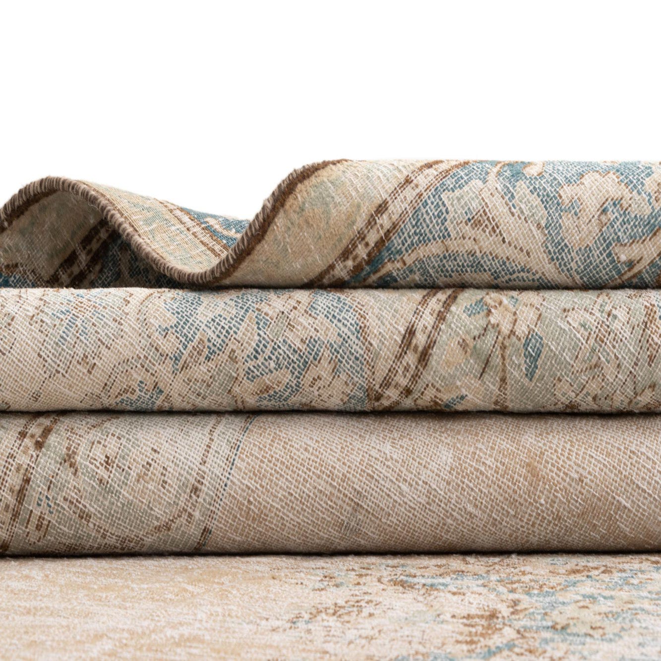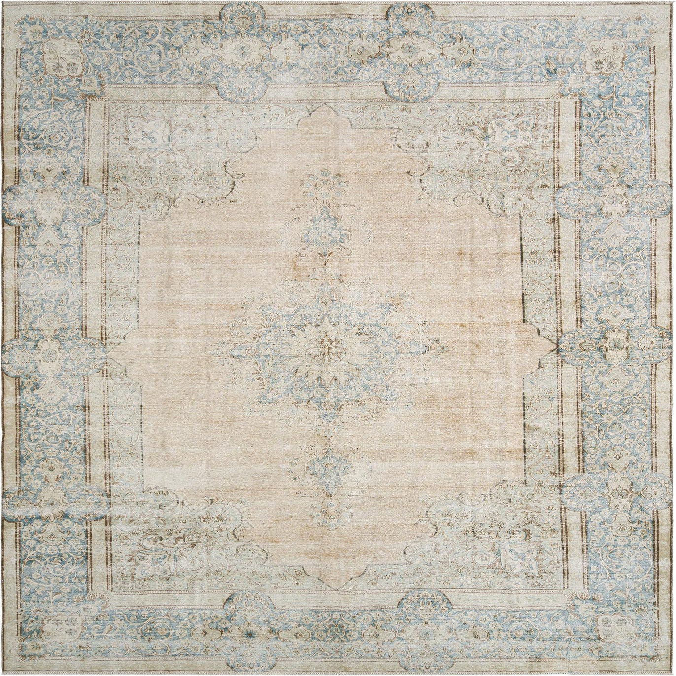 Primary color is Beige. Colors in this rug include: Beige, Cream, Blue, White.