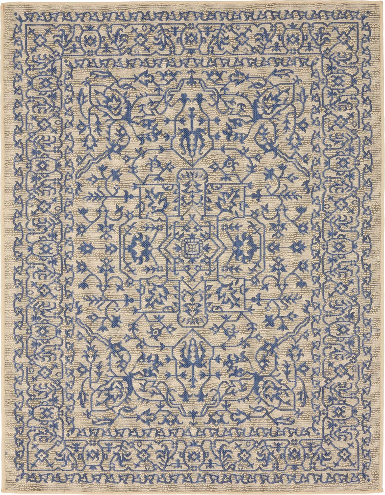 The Outdoor Botanical collection offers a blend of durability and style, as showcased in this 4x6 area rug. Machine-woven from 100% polypropylene, it presents a timeless botanical pattern that enriches your space with its classic charm. The intricate floral and foliage motifs in a striking blue hue stand out against the beige and blue background, creating a visual aesthetic that is both inviting and dynamic.