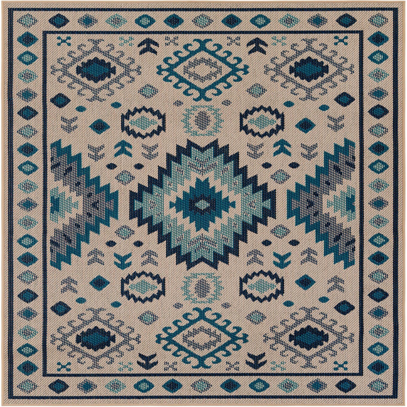 Machine-made from 100% polypropylene, this flatweave-style rug has a low-profile texture that feels slightly textured underfoot while laying smooth and even across the floor. A beige-and-blue background sets a neutral canvas for a lively arrangement of navy and turquoise geometric motifs: a central stepped diamond medallion flanked by angular zigzags, smaller lozenges and medallion accents, and a framed border of alternating diamond shapes. The combination of beige, blue and navy creates a balanced contrast that brings both warmth and cool tones into a space.