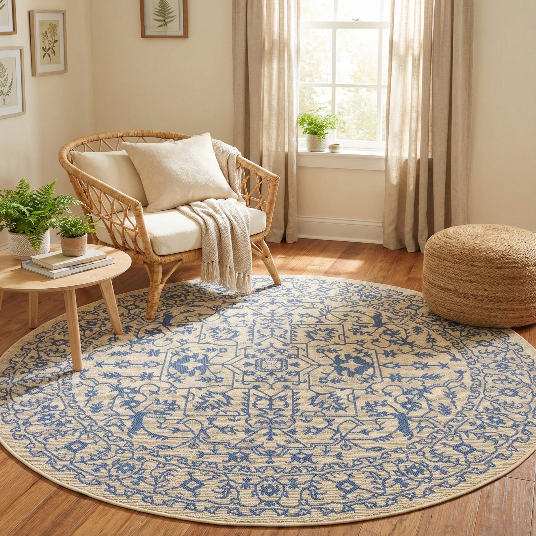 This round rug anchors a cozy seating group or bistro table, and complements coastal, cottage, farmhouse, or transitional interiors. Pair it with light wood or white-painted furniture, woven rattan accents, and navy or denim textiles for a layered, casual scheme; it also works well on a covered porch, sunroom, or under a small dining set to bring pattern and warmth to the space.