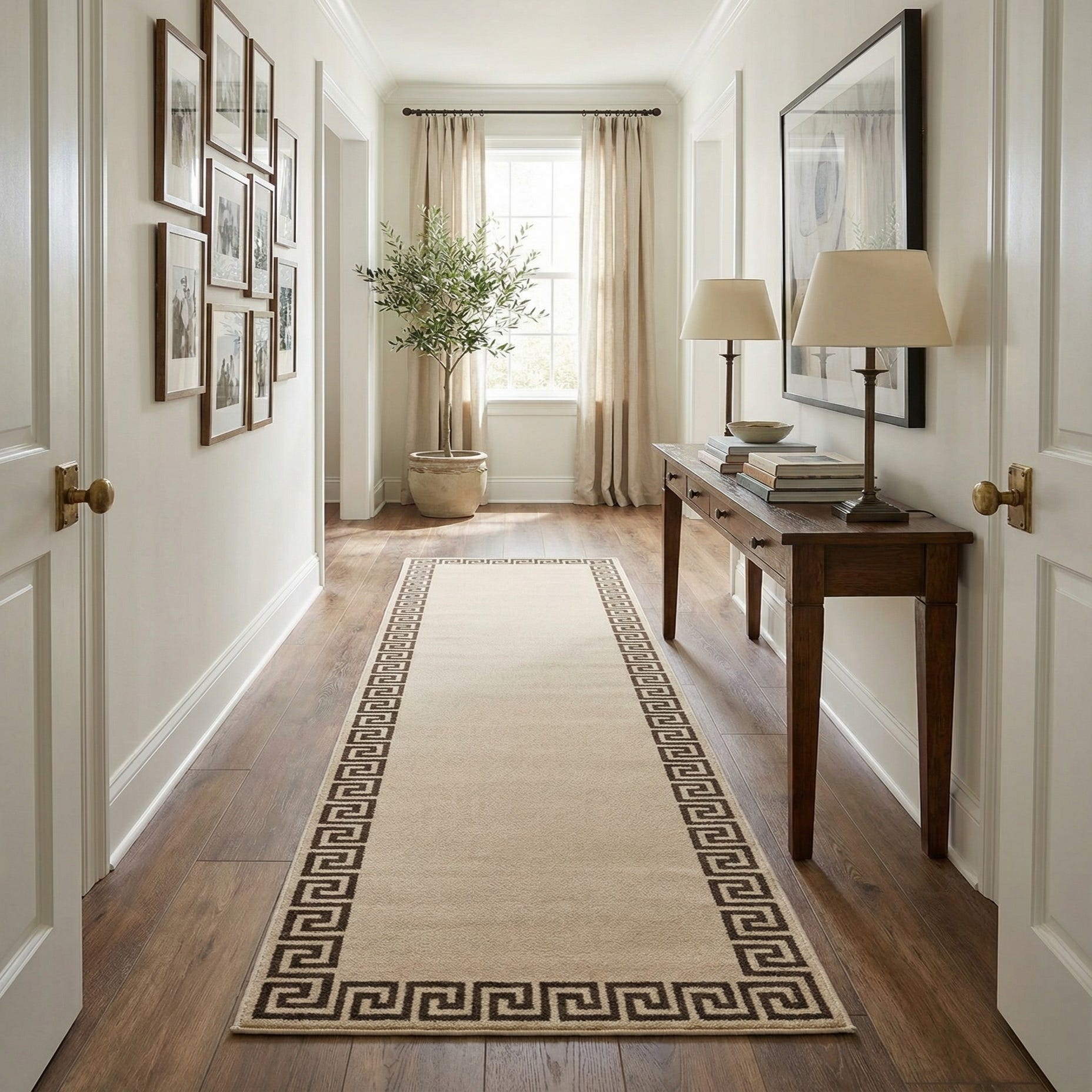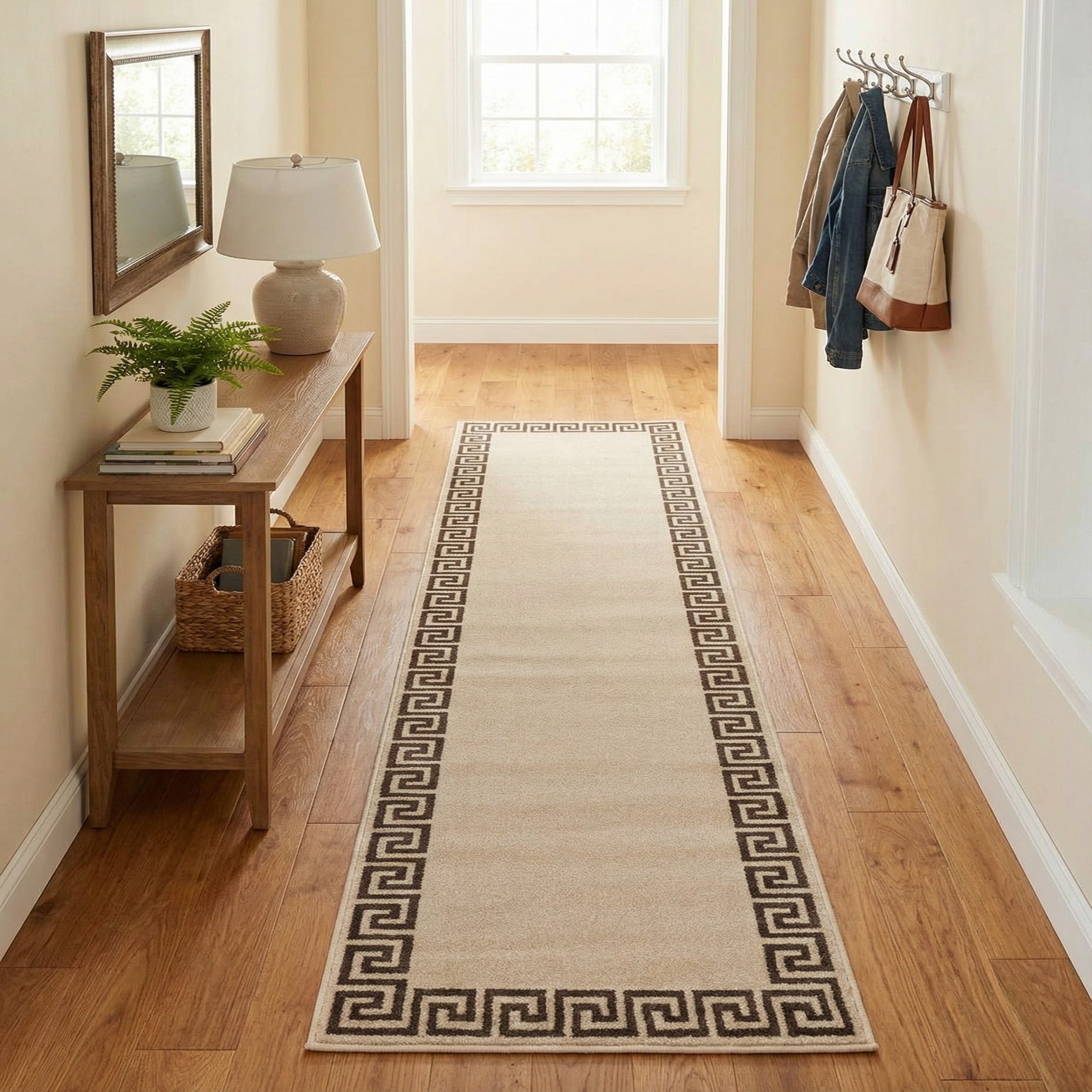 A 10 ft runner rug with a light tan field and a dark brown Greek key border, ideal for a hallway.