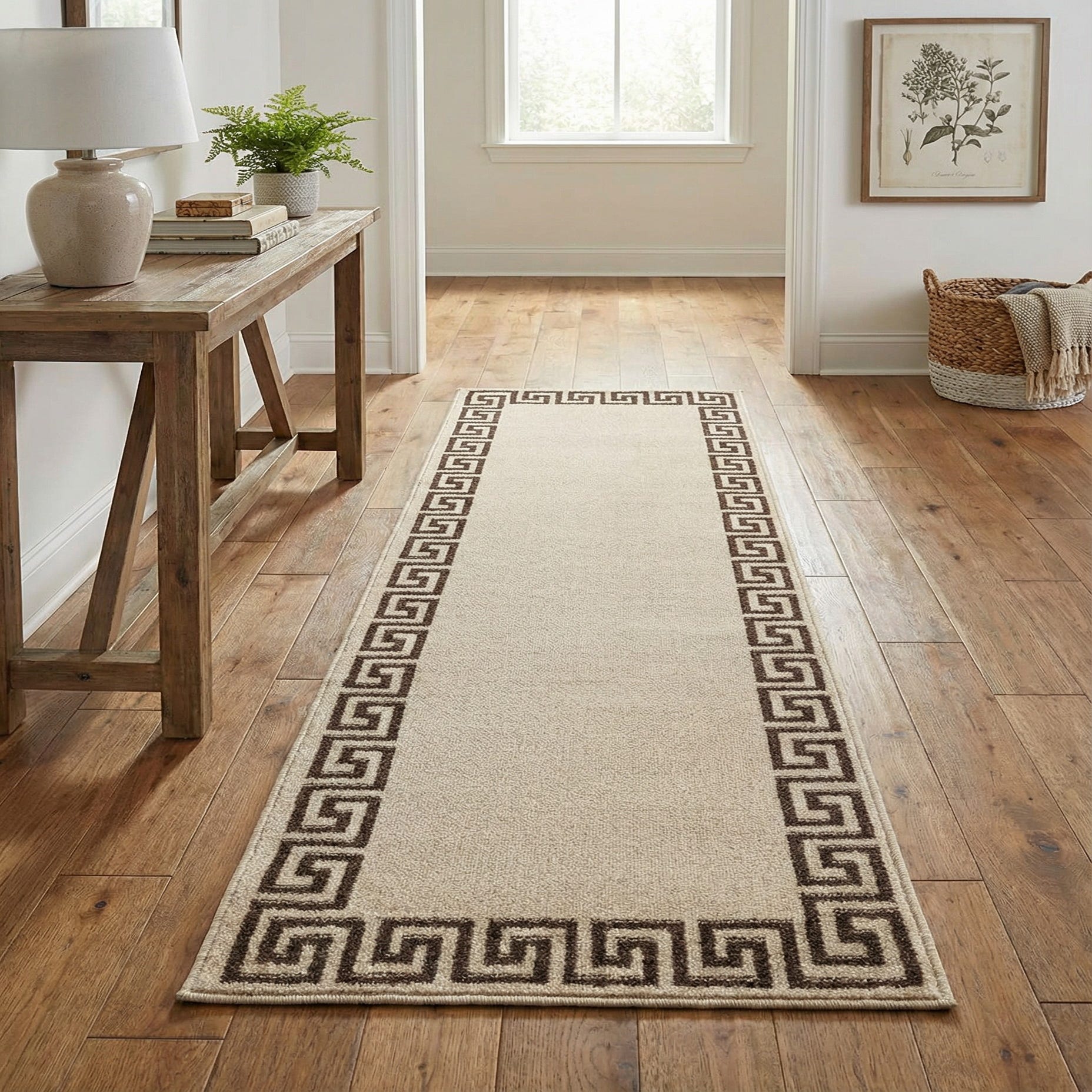 A clean, neutral field in warm beige anchors this runner while a repeating brown Greek-key border frames the center with crisp geometry. The pattern reads classic yet restrained, lending architectural interest without competing with other furnishings. Machine made from 100% polypropylene, the rug has a low, dense pile that feels smooth underfoot and holds its shape along the straight, neatly bound edges.