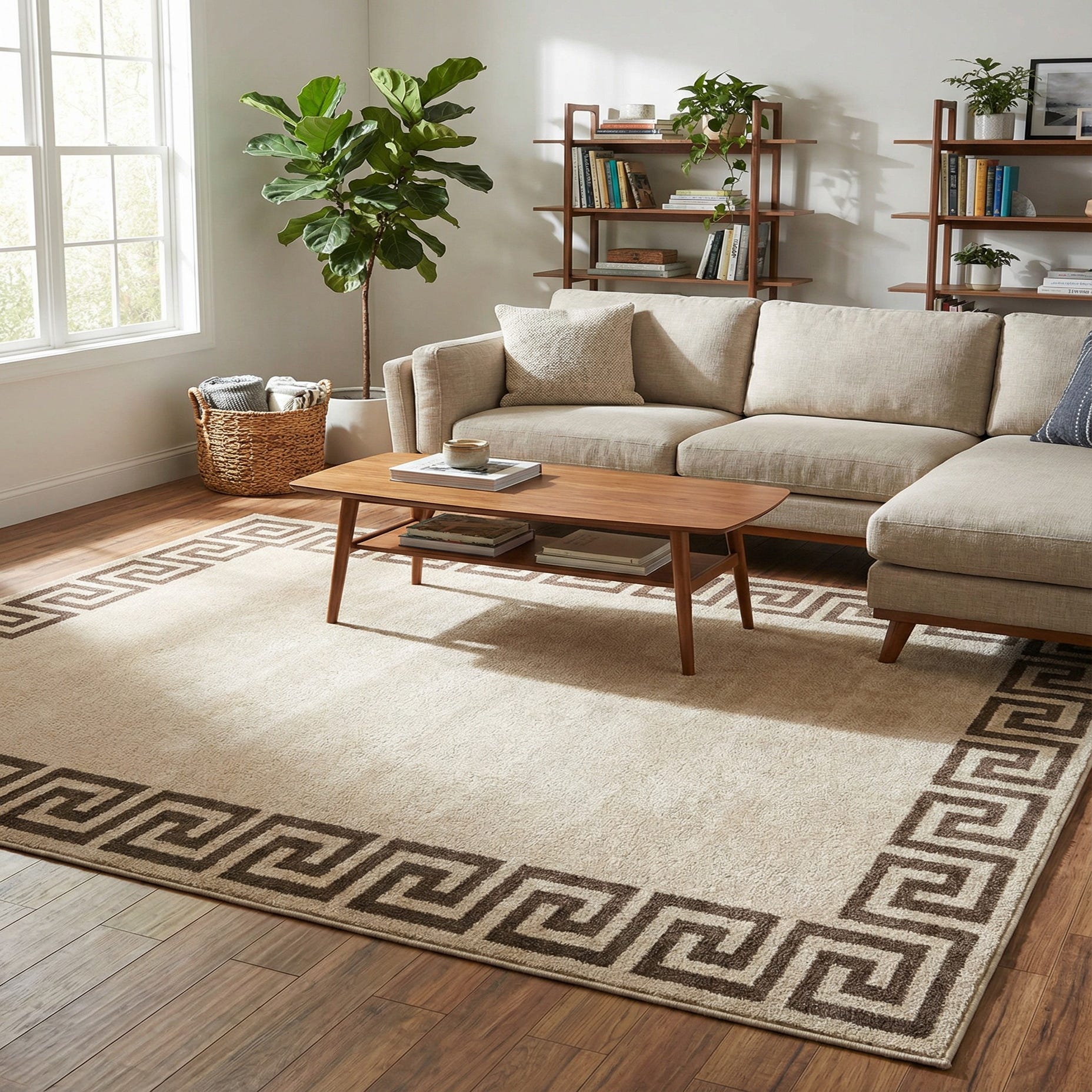 A clean, geometric Greek-key border in rich brown frames a warm beige field, creating a balanced, tailored look that complements many decorating styles. The pattern is crisp and orderly, with the repeating border providing a clear edge while leaving the central field calm and uncluttered. Machine-made from 100% polypropylene, the pile is low and even with a soft, slightly lustrous hand underfoot that maintains its shape and tonal depth.