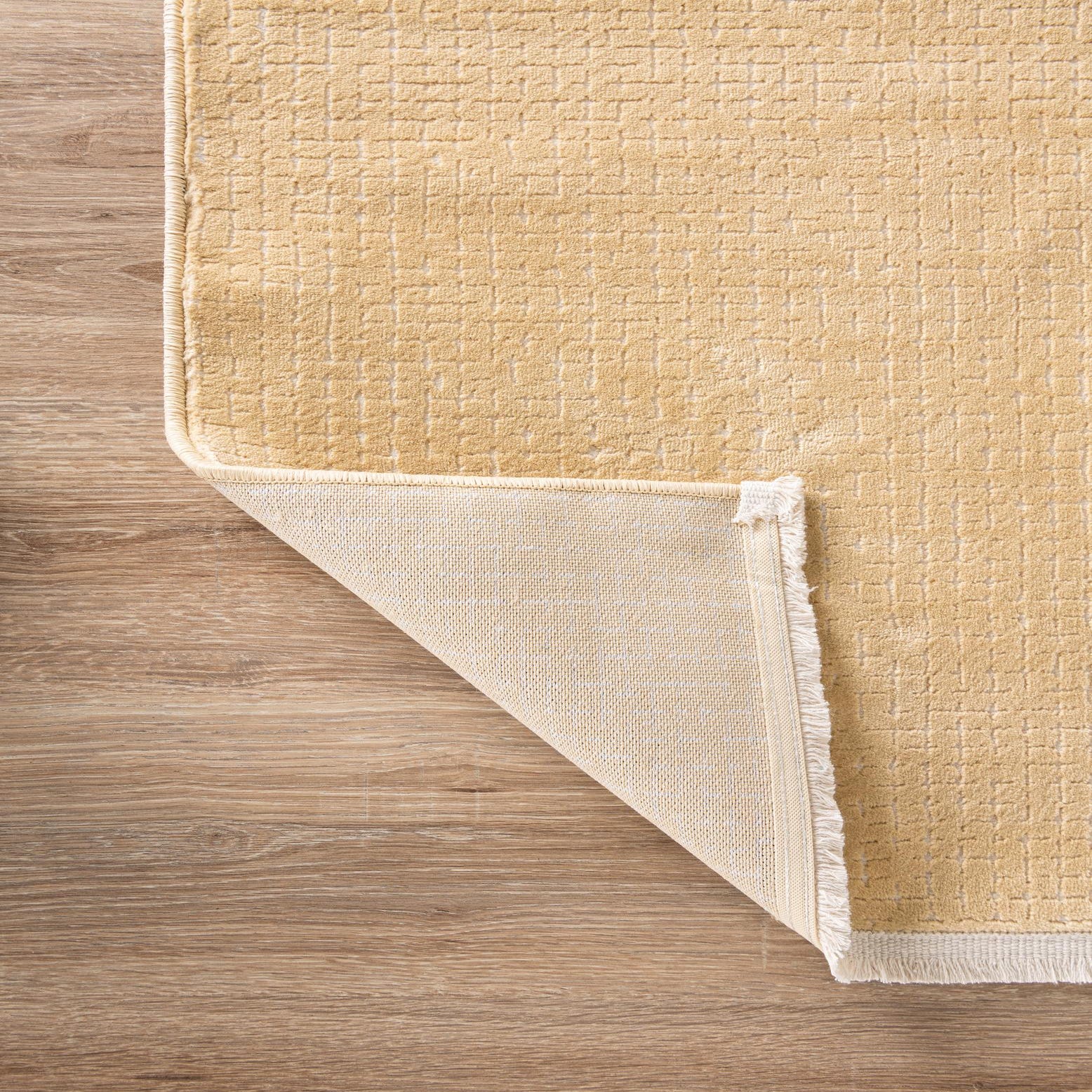 A warm beige background threaded with cream highlights gives this runner a soft, tone-on-tone look that feels calm and collected. A low-profile linear grid of short, irregular dashes crosses the surface, creating gentle depth without high contrast; the pattern reads as subtle texture rather than a bold motif. Machine-made from 85% polypropylene and 15% chenille, the pile has a soft, slightly velvety hand—chenille fibers add a faint sheen and plush touch while the polypropylene keeps the surface stable and easy to place.