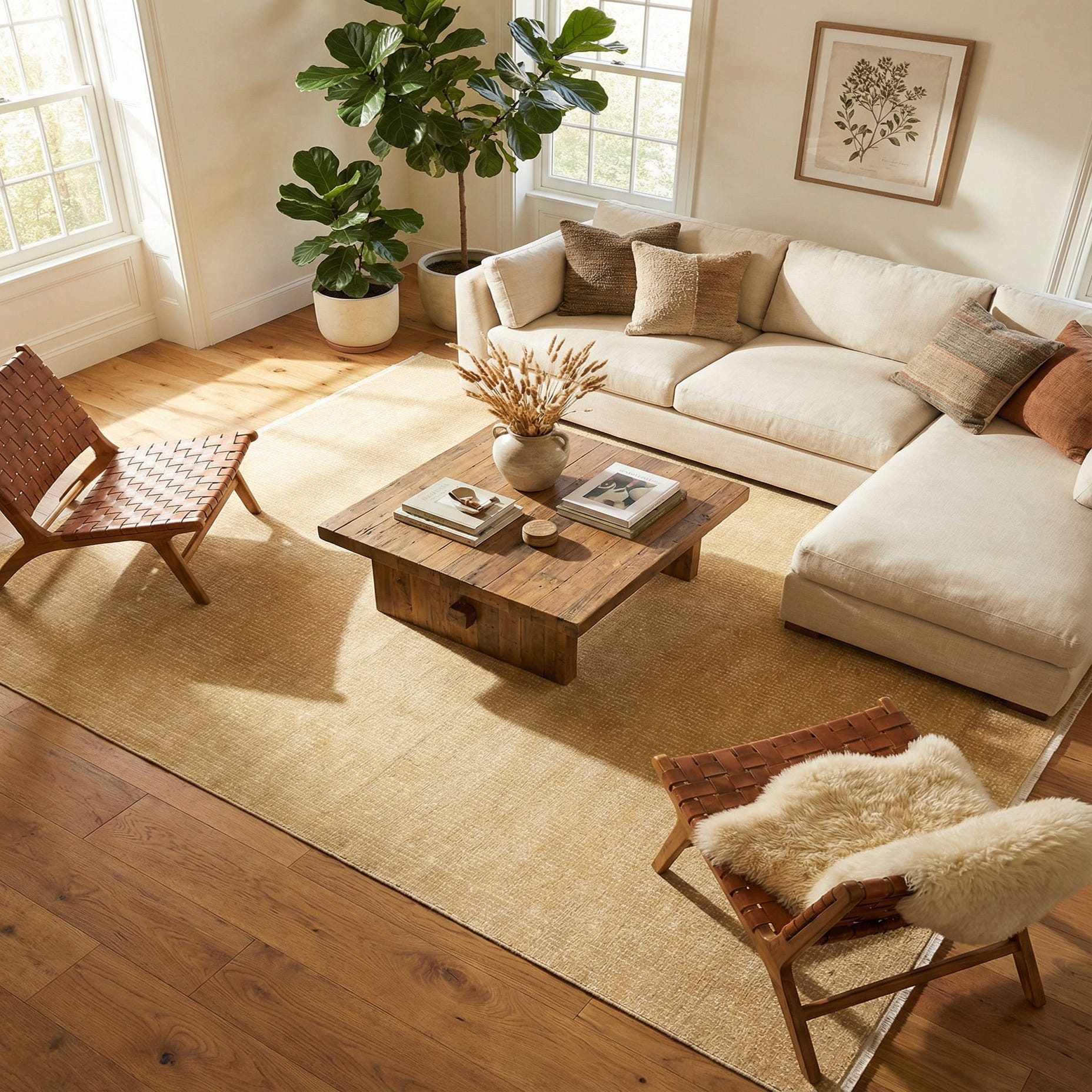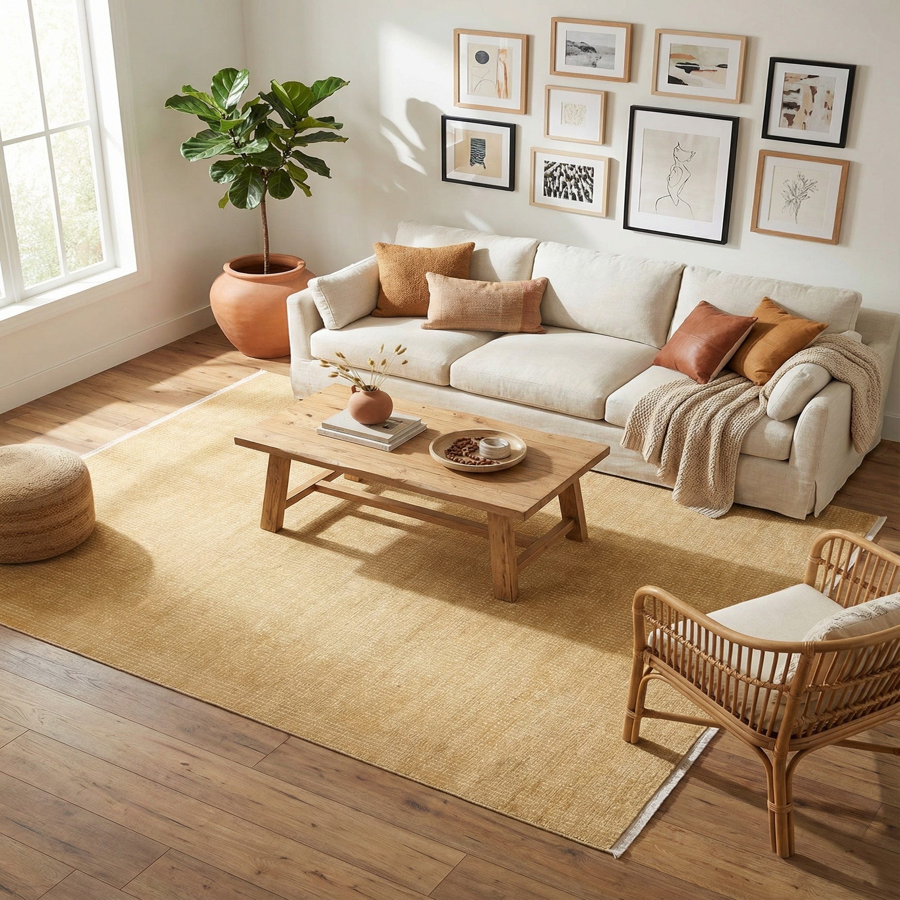 Place it under a living room seating group to anchor sofas and a coffee table, layer it beneath a dining table for a calm, cohesive setting, or use it in a bedroom to introduce soft texture at the foot of the bed. It pairs naturally with light wood tones, linen upholstery, neutral textiles, and soft metallic accents — ideal for Scandinavian, contemporary, coastal, or relaxed transitional interiors that favor a warm, collected feel.