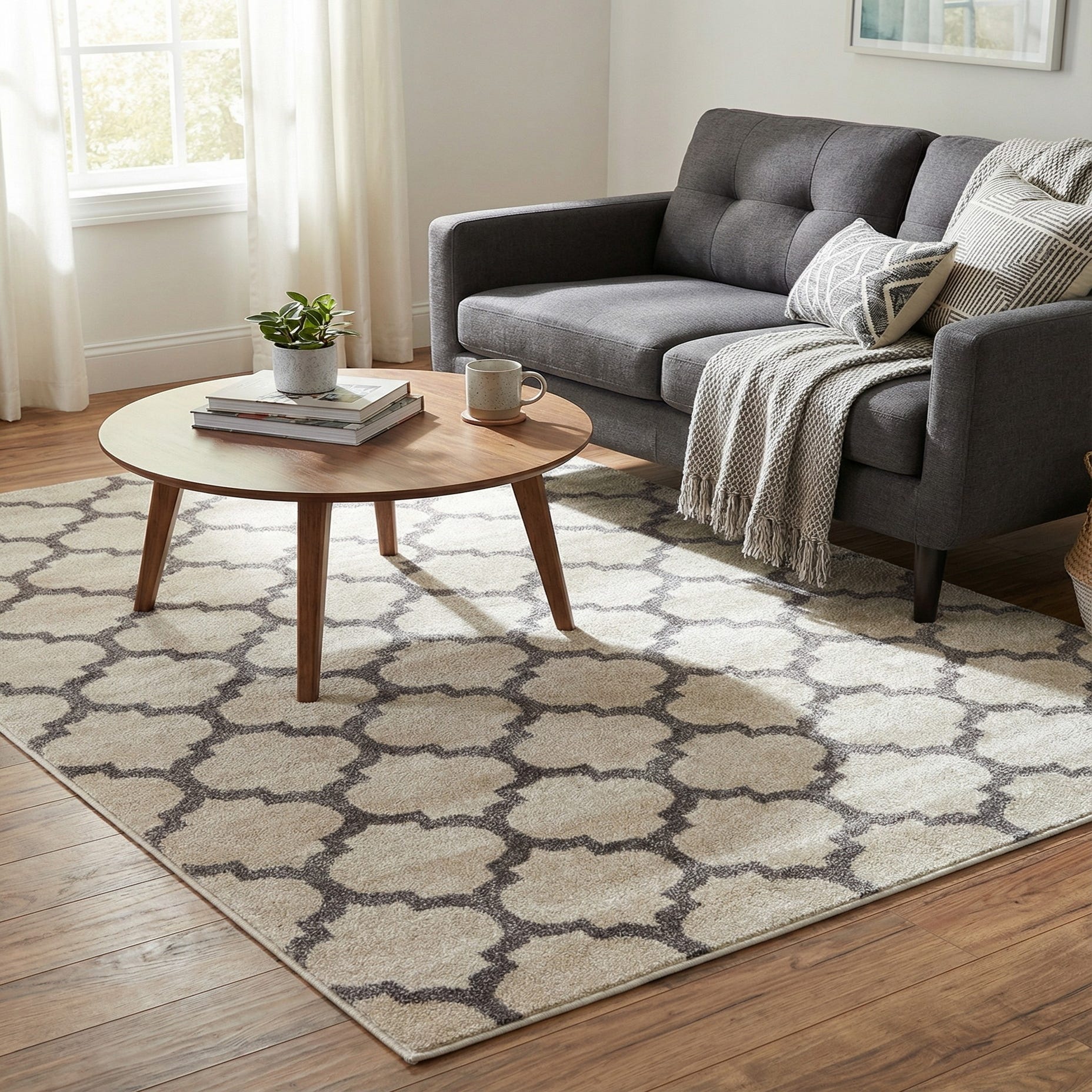 A soft beige-and-gray ground forms a calm backdrop for a repeating lattice of medium gray quatrefoil shapes. The pattern is clean and geometric with a subtle nod to classic Moroccan trellis work, giving the rug a balanced, timeless look. Machine made from 100% polypropylene, the pile is low-profile and densely constructed, offering a smooth, slightly lustrous surface that feels cushioned underfoot while holding its shape across high-traffic areas.