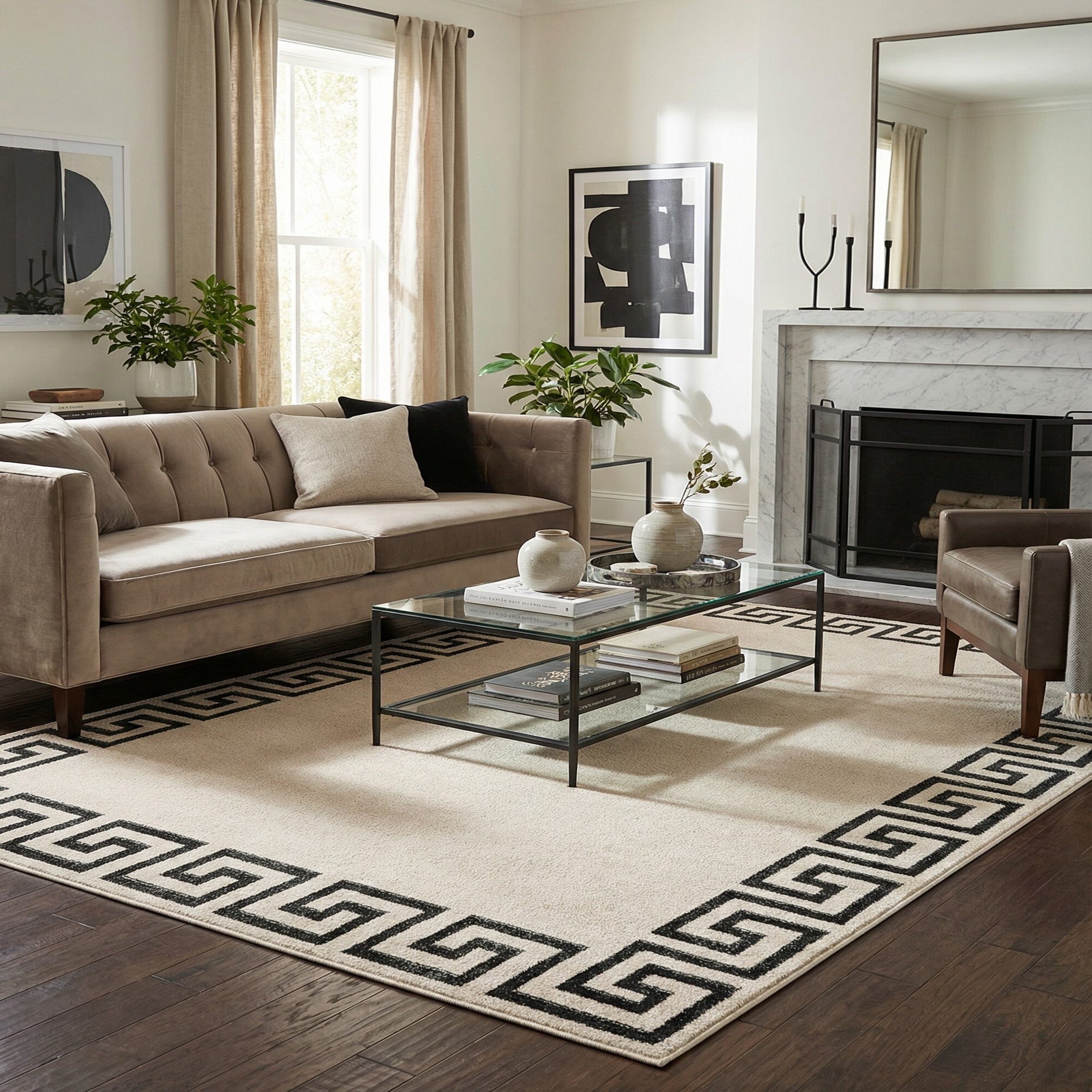 A clean, geometric border gives this rug a structured, modern look. A wide Greek-key motif in black frames a warm beige-and-gray field, creating a clear contrast that reads both classic and contemporary. The repeating border draws the eye while leaving the center open and understated, making the pattern adaptable to a range of layouts and furnishings.