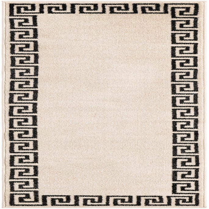 A 6 ft runner rug with a light brown field and a bold black Greek key border pattern, perfect for a hallway.