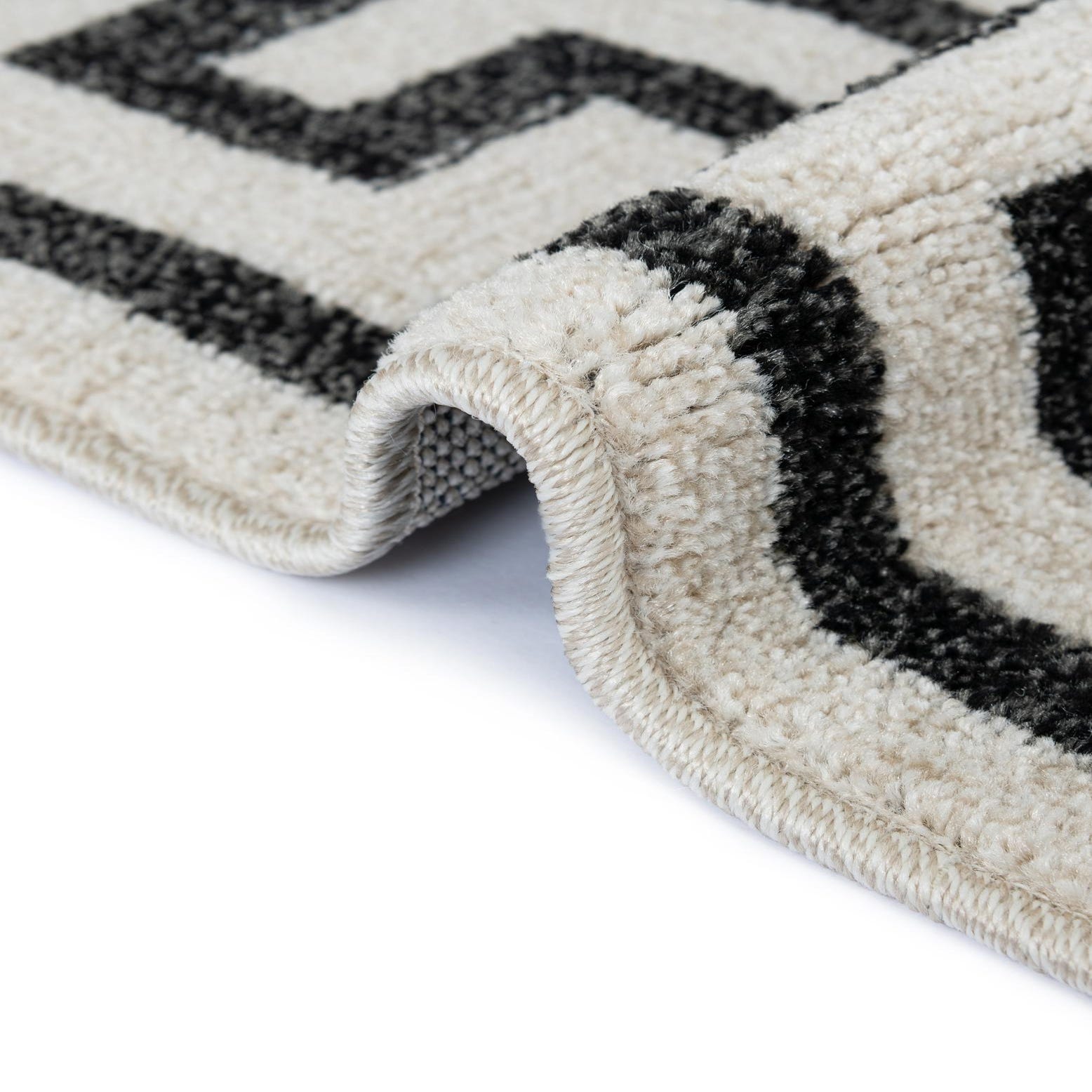 A round design that balances a calm, beige-and-gray field with a bold black Greek key border. The center has a smooth, low-pile surface that feels comfortable underfoot, while the black motif is slightly raised and textural, creating clear contrast and visual depth. Machine made from 100% polypropylene, the construction produces a consistent pattern and a refined, low-profile hand.