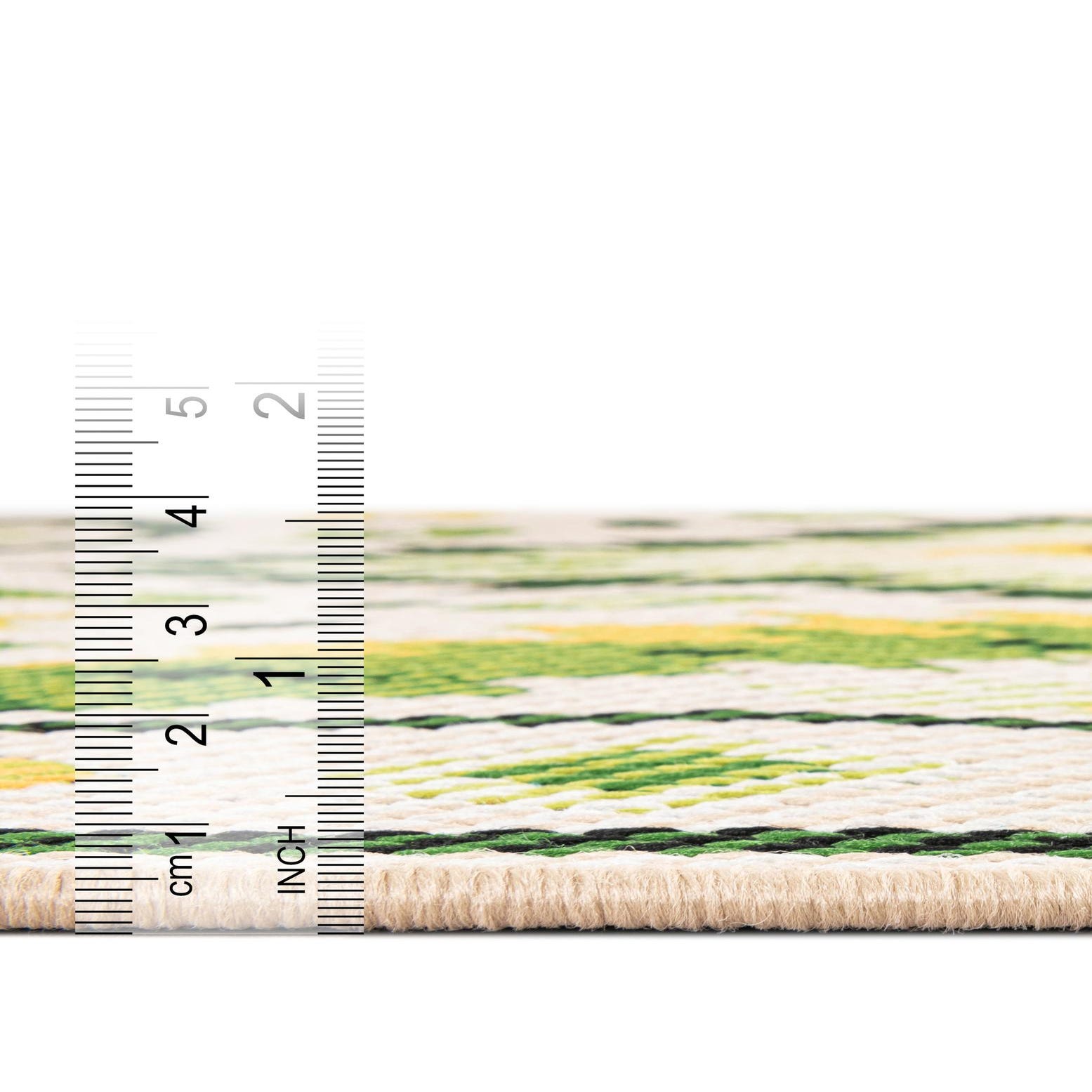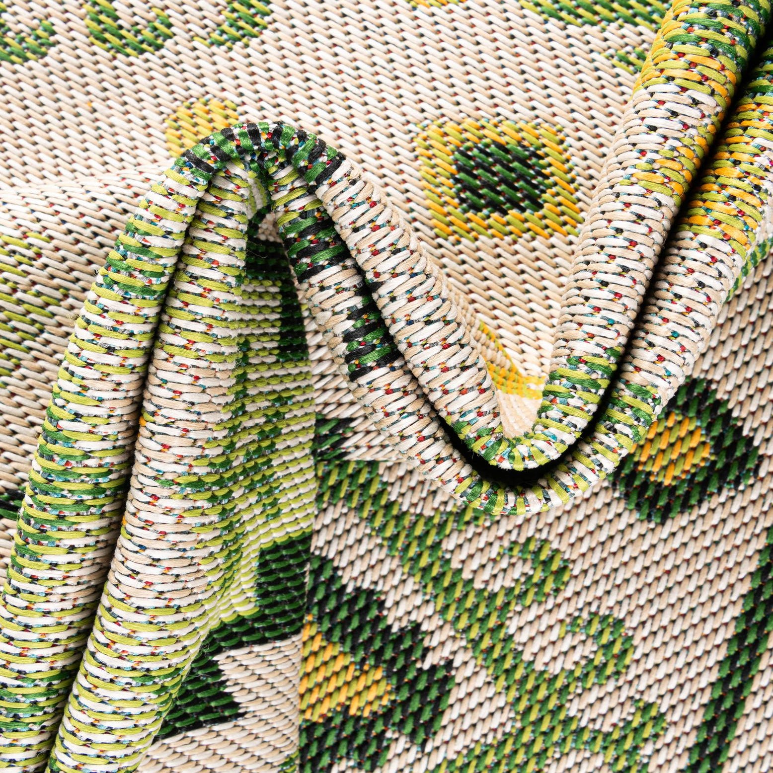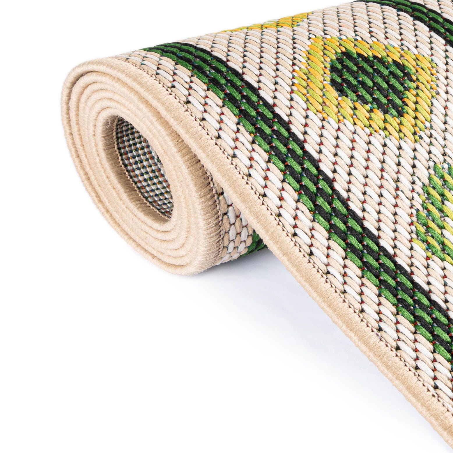 Machine made of 100% polypropylene, the rug has a low-profile, flat-woven texture that feels firm and slightly textured underfoot, with clean edge definition and a tactile weave you can run your hand across. It works well on covered patios and sunrooms, beneath an outdoor dining setup or layered with natural-fiber seating; indoors it complements bohemian, coastal, or modern farmhouse schemes when used to anchor a casual living area or define a conversation group. Pair it with rattan or teak furniture, woven baskets and potted greenery for a relaxed, pulled-together look.