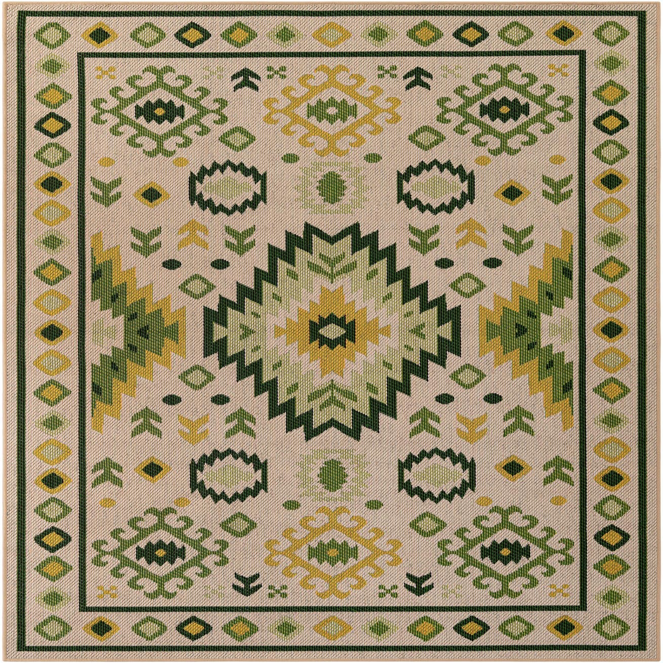 A lively geometric medallion anchors this flatwoven rug, where tribal-inspired motifs and repeating diamond borders create a structured, layered look. The background of the piece is beige and green, with light green and yellow accents layered into stepped chevrons, medallions and small foliate marks. Running your hand across the surface reveals a tight, low-pile polypropylene weave with a subtle texture that reads like a woven outdoor flatweave — the pattern is crisp and the color shifts are clean and well-defined.