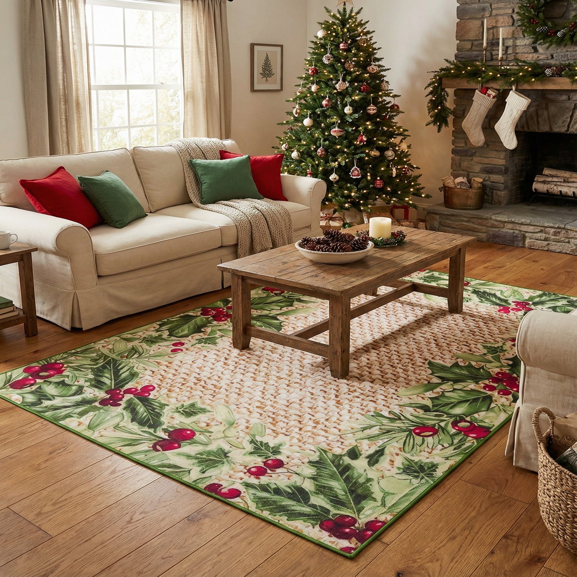 A 6x9 rectangular beige and green rug with a modern holly and berry border pattern, suitable for indoor or outdoor use.