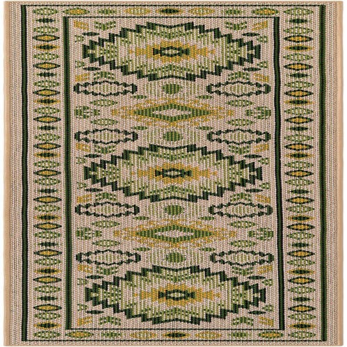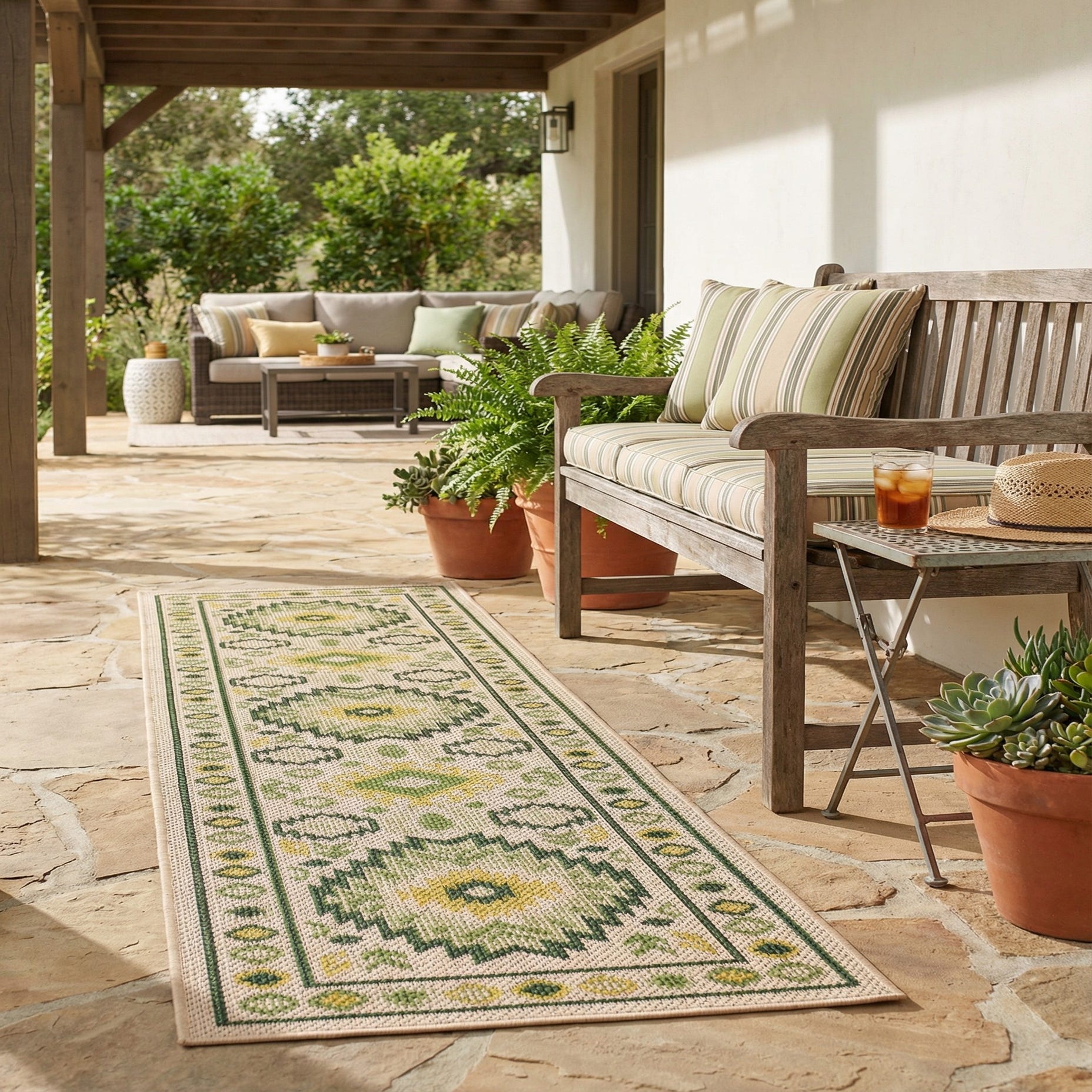 A beige and green 8 ft runner rug with a traditional geometric pattern, ideal for hallways or patios.