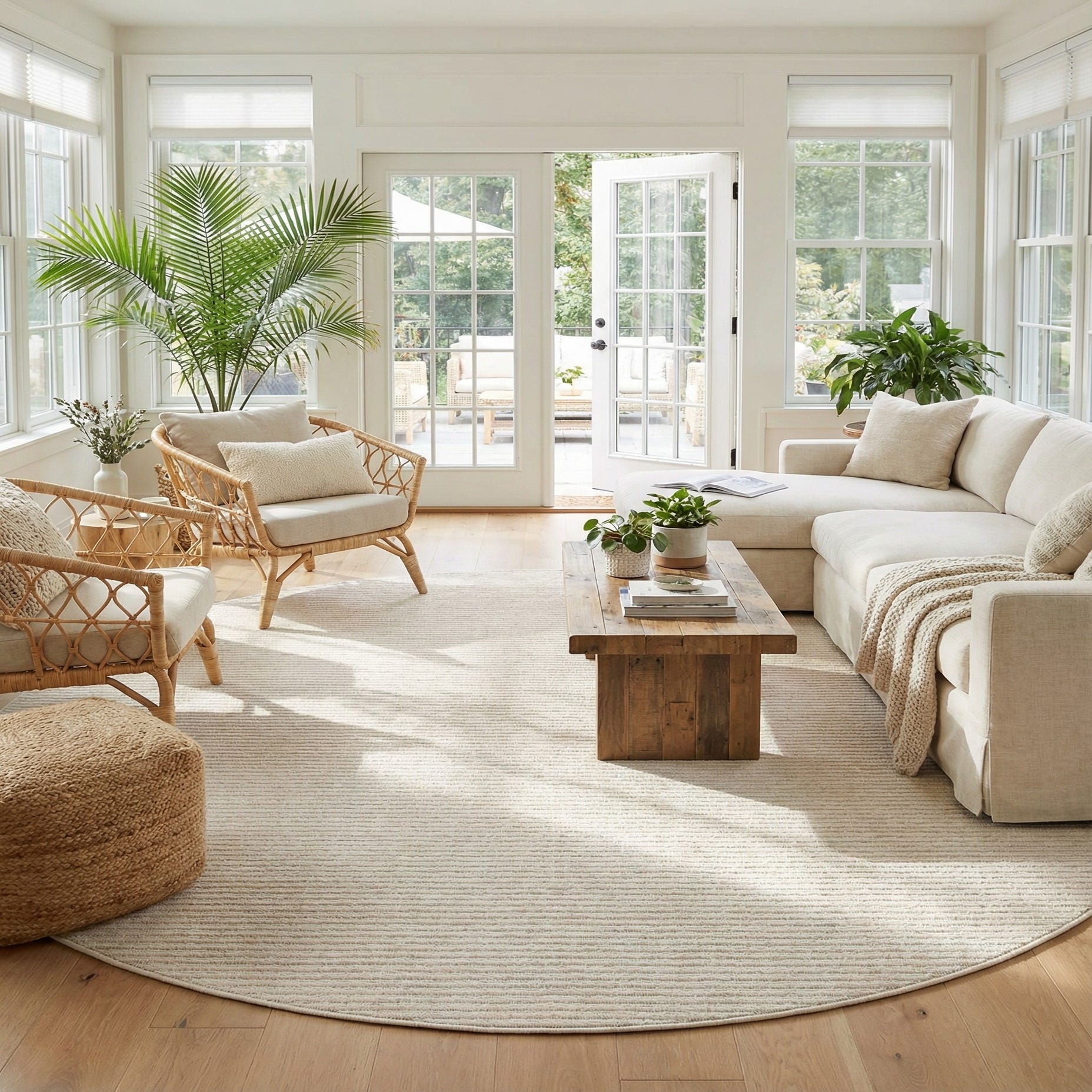 The clean, neutral look fits a range of styles from modern coastal to casual contemporary. Use it to anchor a round dining table on a covered patio, define a small conversation area on a deck, or layer it under a bistro set in a sunroom. Pair the beige and ivory tones with natural woods, rattan or wicker furniture, navy or charcoal accents, and light linens for a relaxed, cohesive setting.
