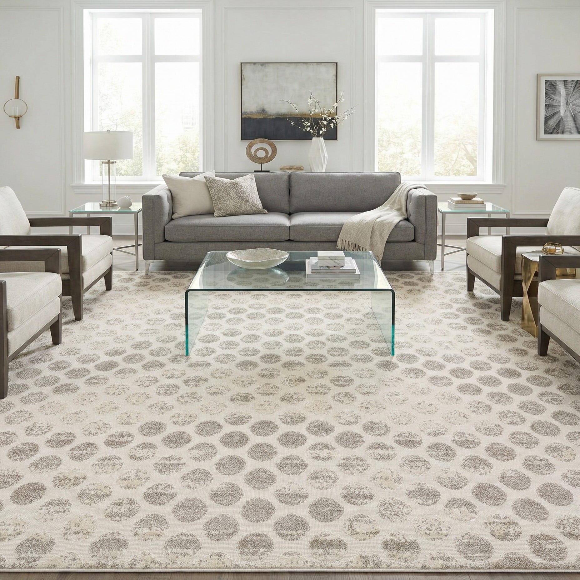 A soft geometric field of evenly spaced circular motifs rests on a beige and ivory ground, the dots rendered in muted sand and taupe tones with a gently distressed surface that adds visual depth. Machine-made from 100% polypropylene, the rug has a low pile with a subtle raised texture in the circles, so you feel a gentle contrast underfoot between the slightly plush motifs and the smoother background.