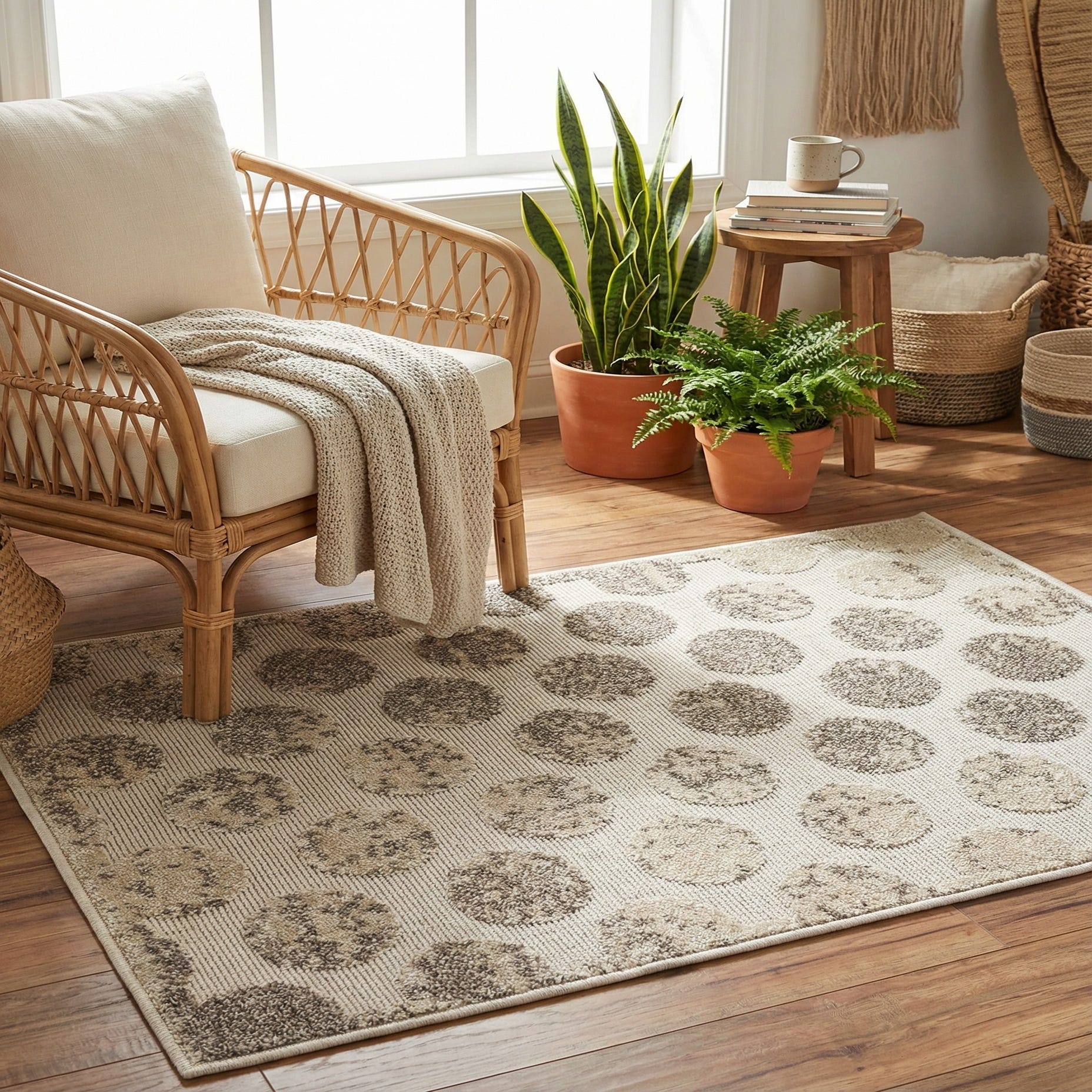 A modern polka-dot motif of raised circular tufts sits against a tightly ribbed beige-and-ivory ground, creating a subtle play of texture and tone. Gray and warm beige highlights within each dot add visual depth without dominating the neutral field. Machine made of 100% polypropylene, the rug combines slightly springy cut-pile tufts with a firmer, low-profile ribbed base so the circles stand out both visually and to the touch.