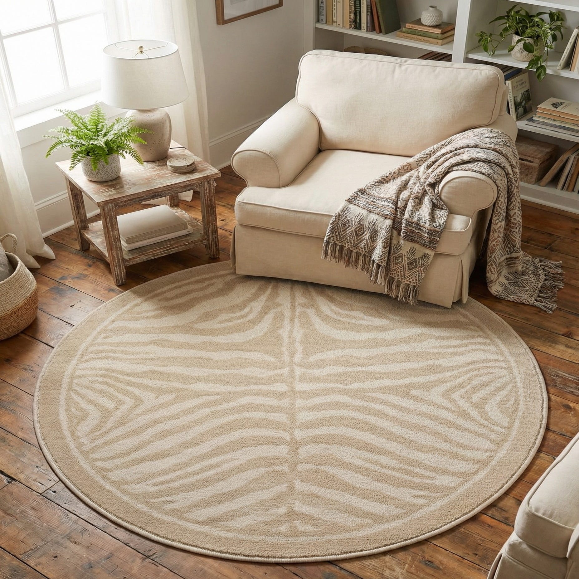A 4' round ivory and cream rug with a modern zebra stripe pattern, perfect for a living room or bedroom.