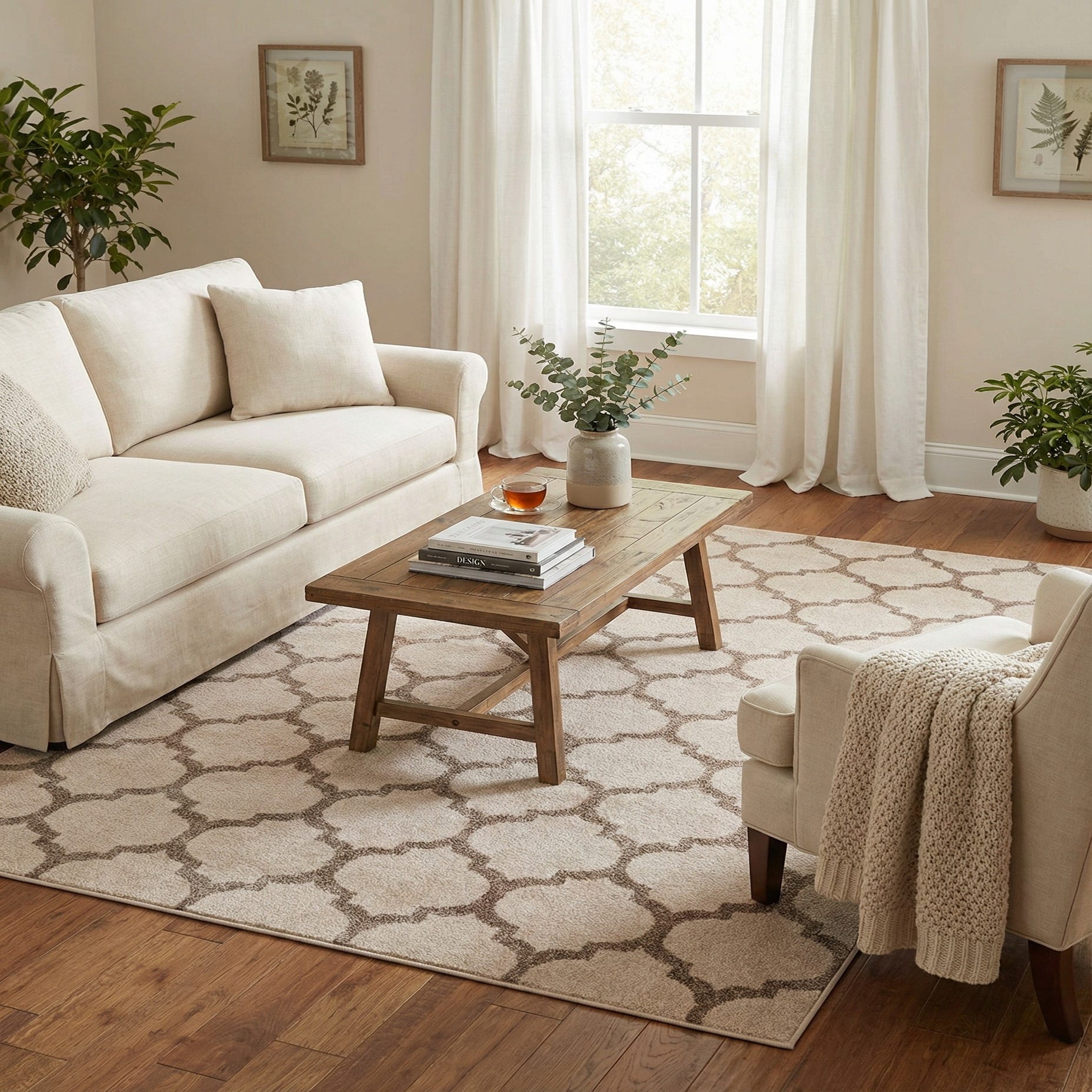 This neutral palette and classic geometric design suit a range of interiors — place it under a living room seating group to ground sofas and a coffee table, layer it at the foot of a bed to add quiet pattern to a bedroom, or roll it into a home office or entry to bring warmth to harder floors. Pair with light wood tones, linen upholstery, rattan accents or leather pieces for a relaxed, cohesive look; it also complements transitional and modern-traditional schemes where subtle patterning is desired.