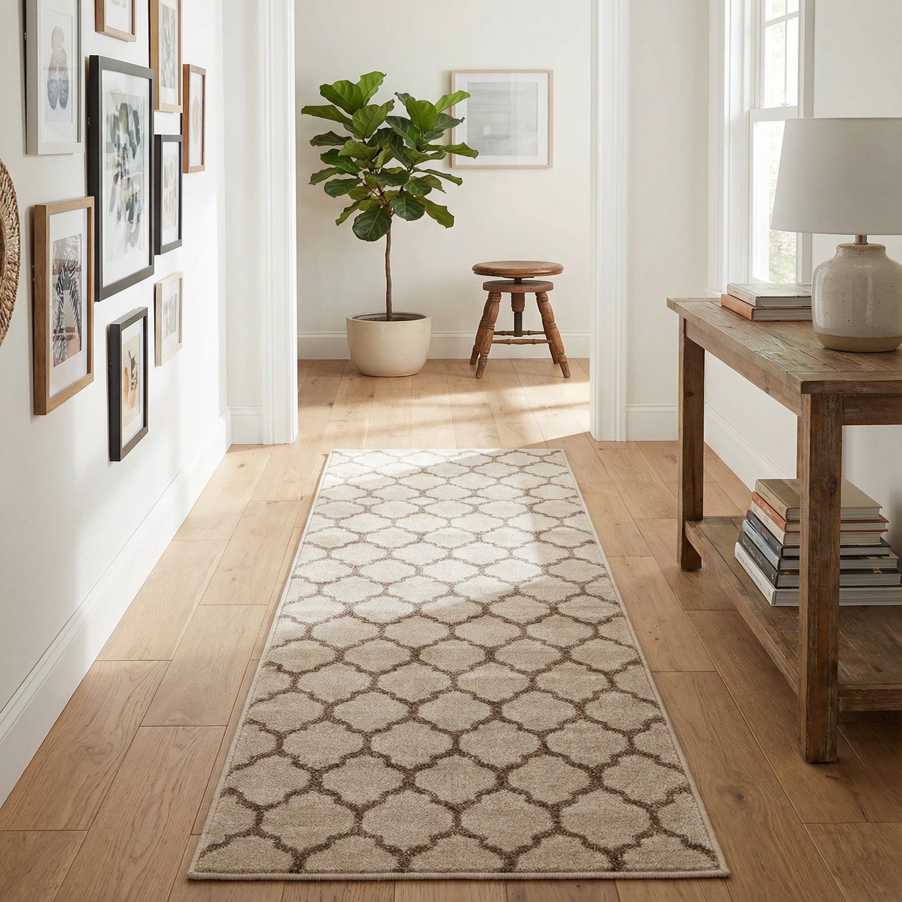 Well suited for narrow traffic areas like hallways and entryways, this runner also works nicely alongside kitchen islands or layered in front of a sofa to add texture and pattern. It complements warm wood floors, cream or taupe upholstery, and transitional or modern farmhouse interiors, and can anchor a neutral palette or provide a calming counterpoint to bolder accent pieces.
