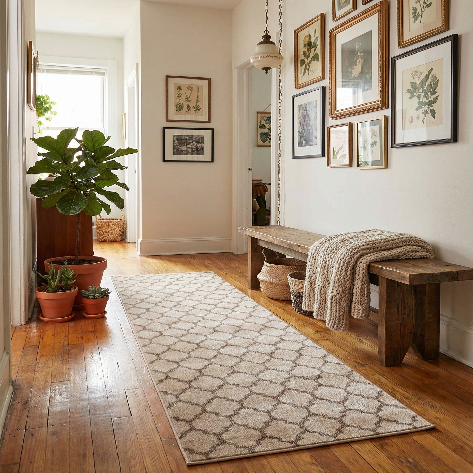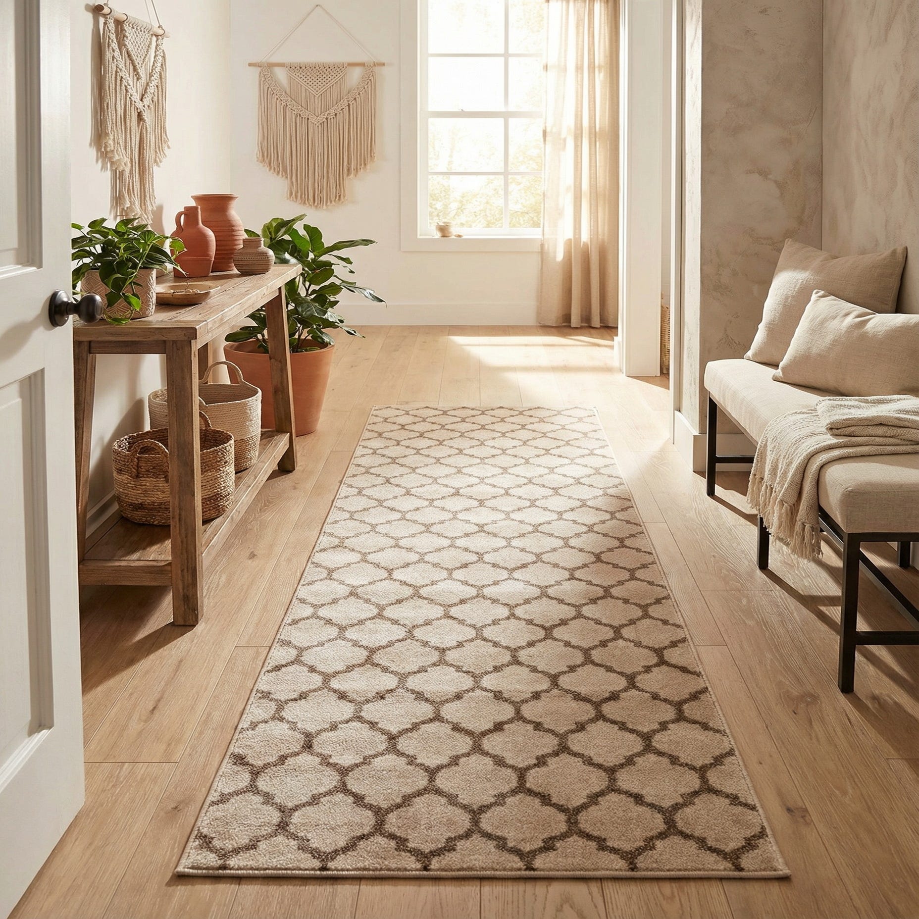 Machine-made from 100% polypropylene, this runner has a low-to-medium pile that maintains its shape in high-traffic areas. It’s well suited for hallways, entryways, kitchen walkways, or alongside a bed. Pair it with light wood or painted floors, neutral upholstery, and brass or matte-black accents for a transitional or modern farmhouse look, or layer it under a console table to anchor an entry with understated pattern and warmth.