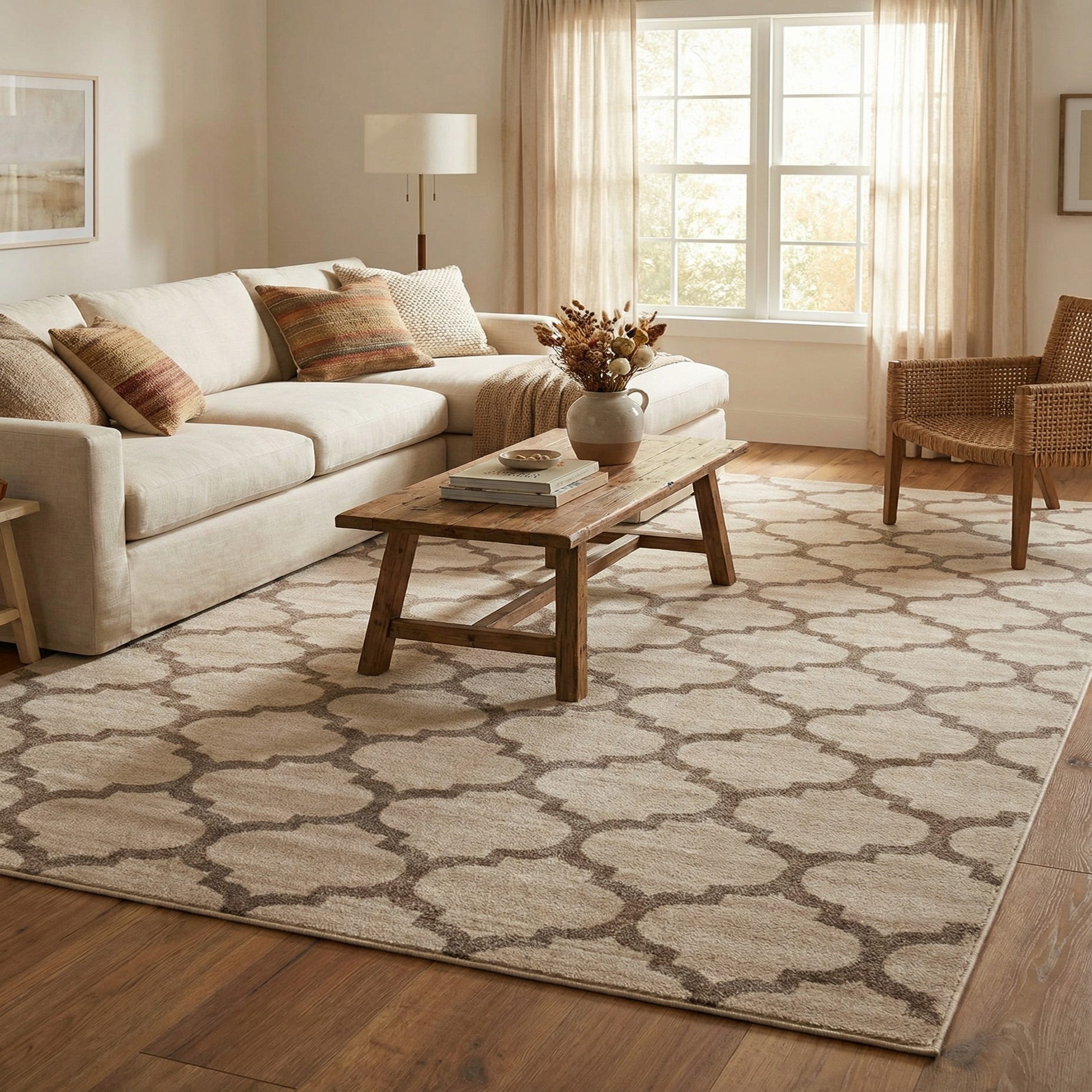 This neutral palette and classic motif work well in living rooms, bedrooms, dining areas, or a home office, where it can ground a seating group or soften hardwood or tile floors. Pair it with natural woods and linen upholstery for a relaxed, transitional look, or layer it with textured throws and matte-metal accents for a contemporary-meets-farmhouse feel. The understated colors make it easy to coordinate with both cool and warm tones, letting other décor pieces take center stage.